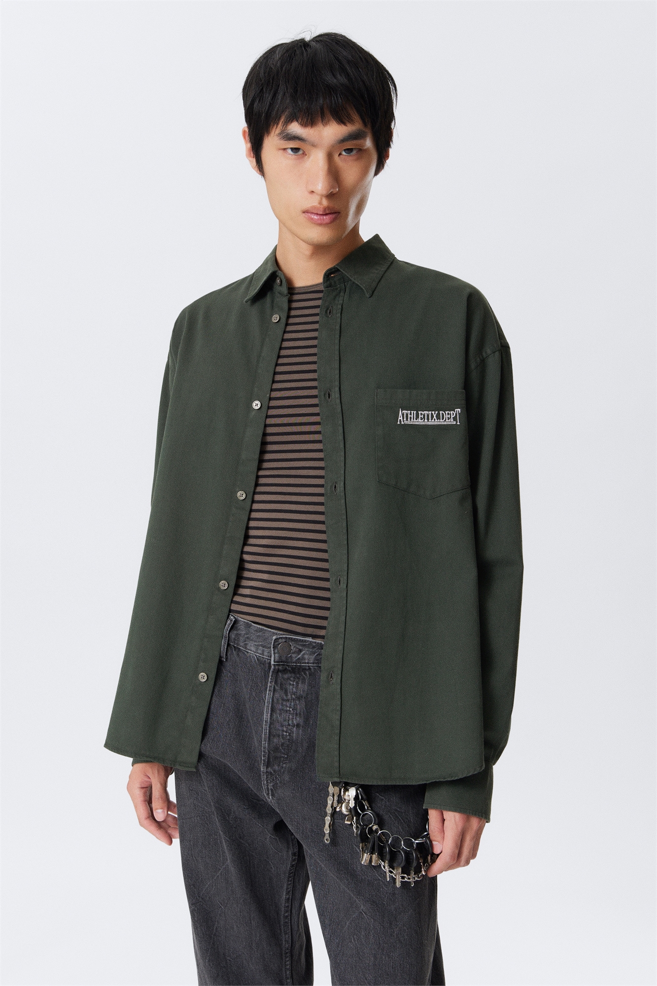 Рубашка оверсайз с непринужденным силуэтом. Изготовленная из мягкого хлопка, она имеет заостренный воротник, застежку на пуговицы и накладной карман на груди с вышивкой. Рубашка имеет спущенные плечи, широкие манжеты и закругленный подол, что придает ей непринужденную форму.