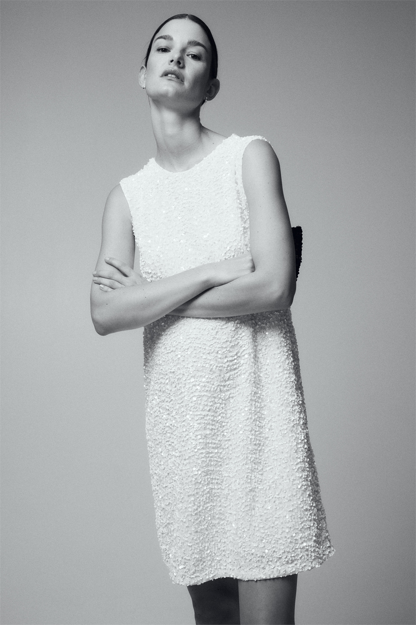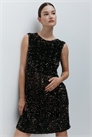 Мини-платье без рукавов из блестящего велюра с круглым вырезом спереди и глубоким V-образным вырезом сзади с большим декоративным бантом. На подкладке.