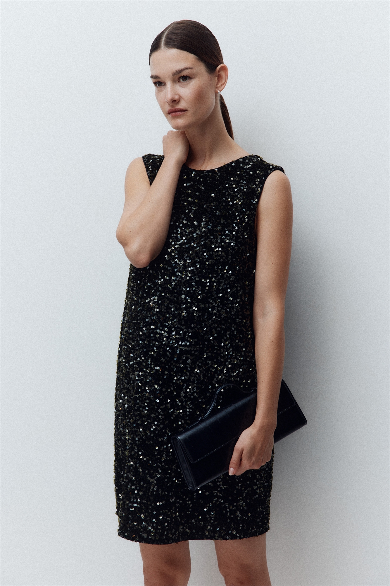 Мини-платье без рукавов из блестящего велюра с круглым вырезом спереди и глубоким V-образным вырезом сзади с большим декоративным бантом. На подкладке.