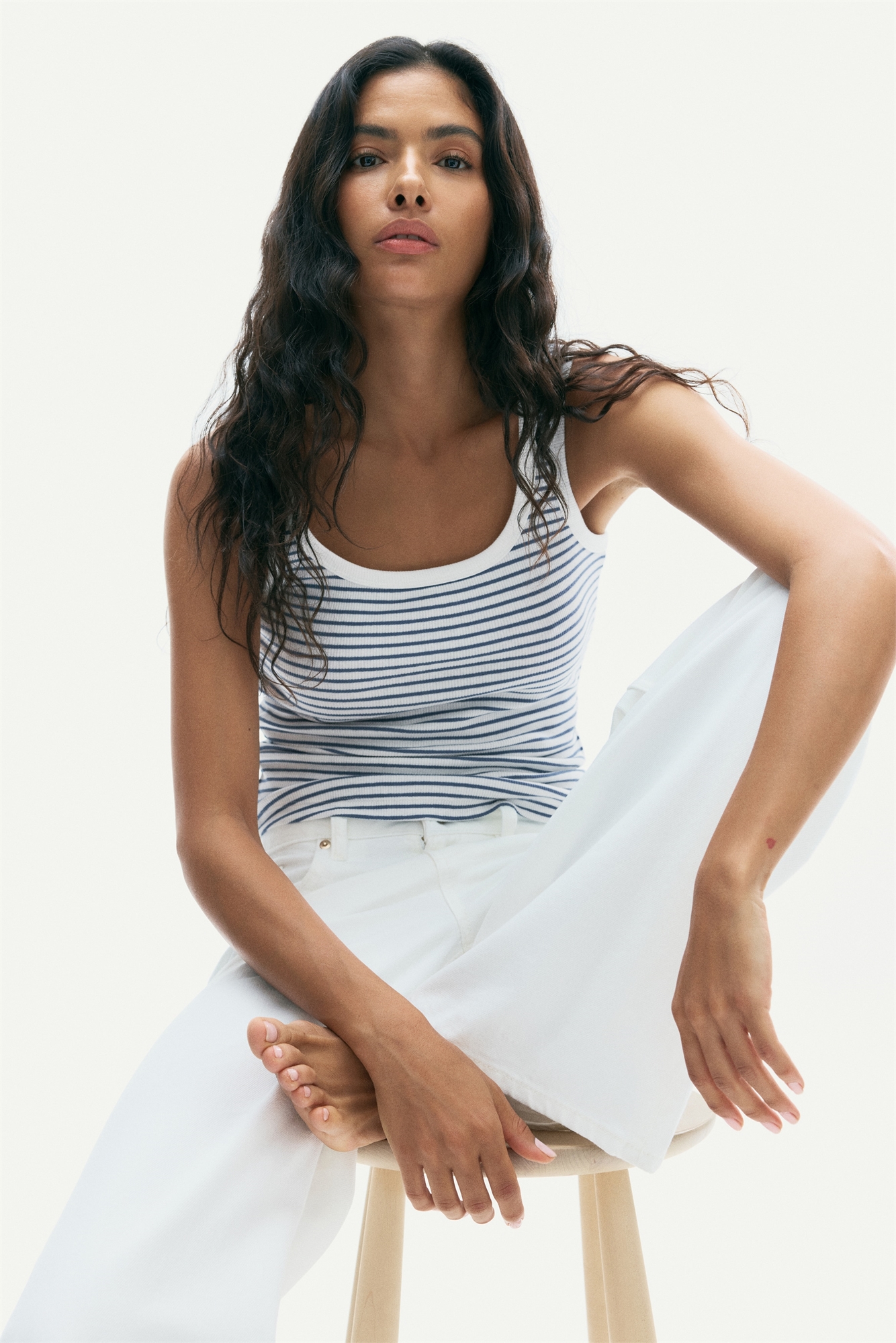 Приталенный топ из ребристого трикотажа с вырезом-лодочкой и прямым кроем.