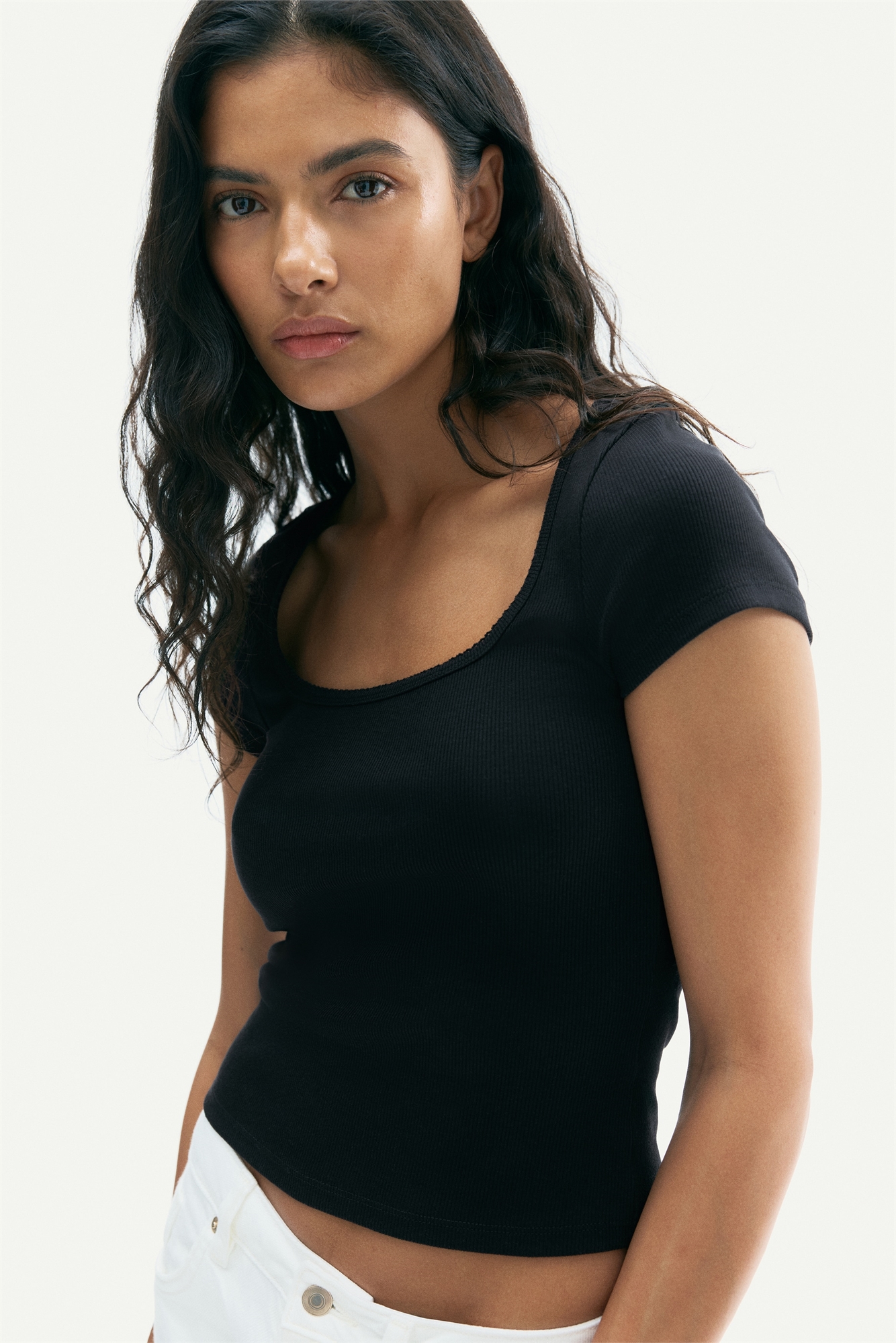 Короткая приталенная футболка из ребристого хлопкового джерси с глубоким квадратным вырезом и тонкой отделкой пико.