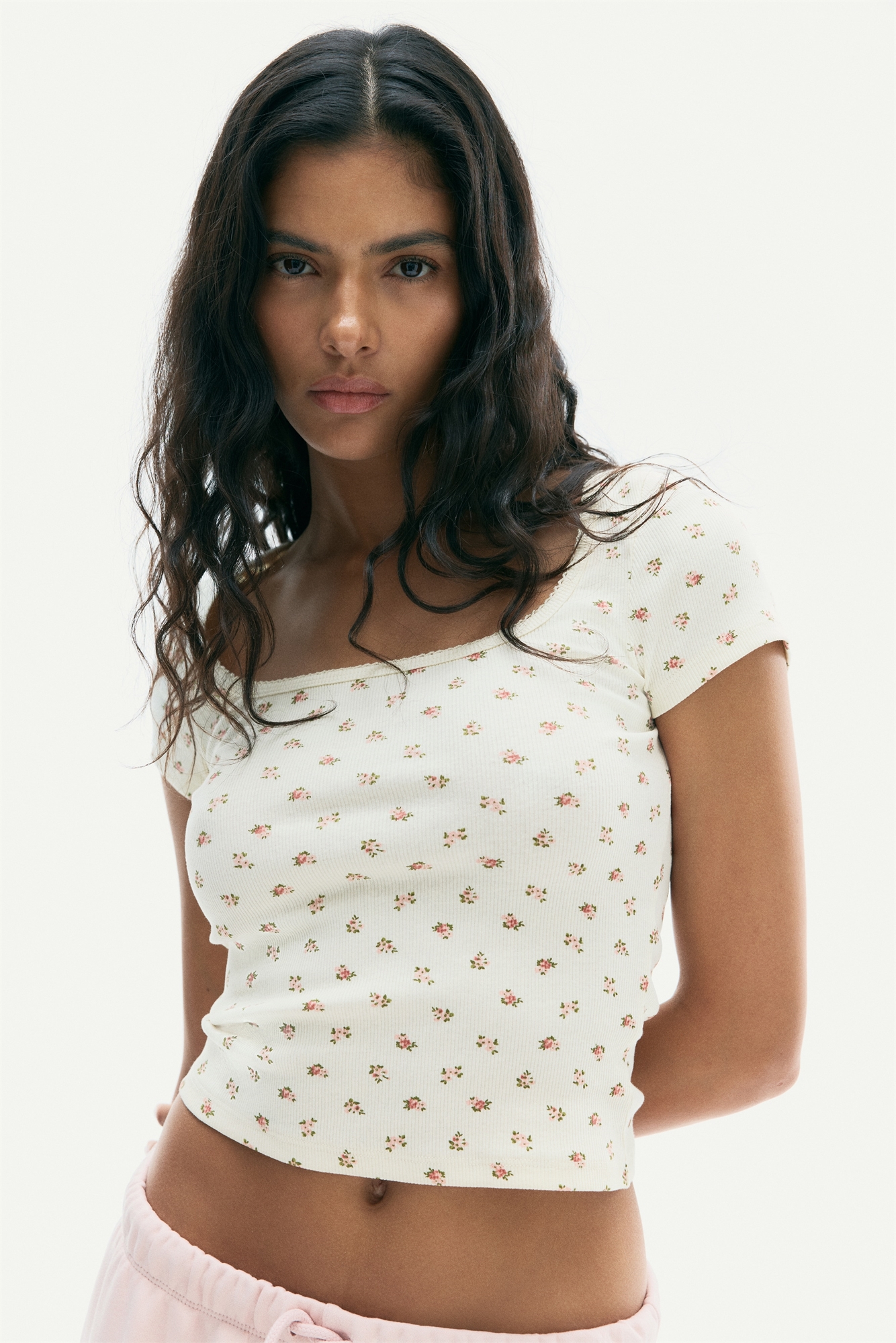 Короткая приталенная футболка из ребристого хлопкового джерси с глубоким квадратным вырезом и тонкой отделкой пико.