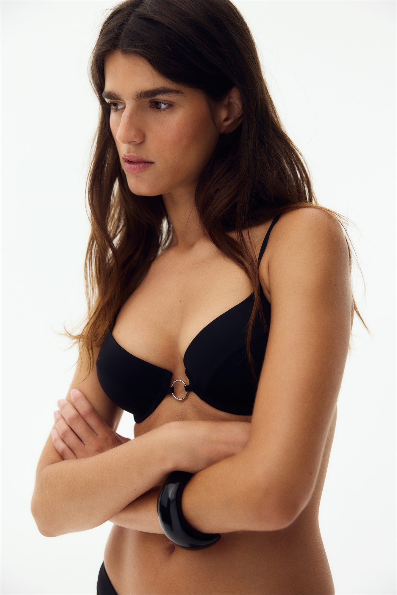 Бикини-топ на подкладке с регулируемыми бретелями, декоративным металлическим кольцом в центре бюста и мягкими чашечками с заниженной талией для увеличения объема бюста и декольте. Регулируемая застежка-крючок сзади.