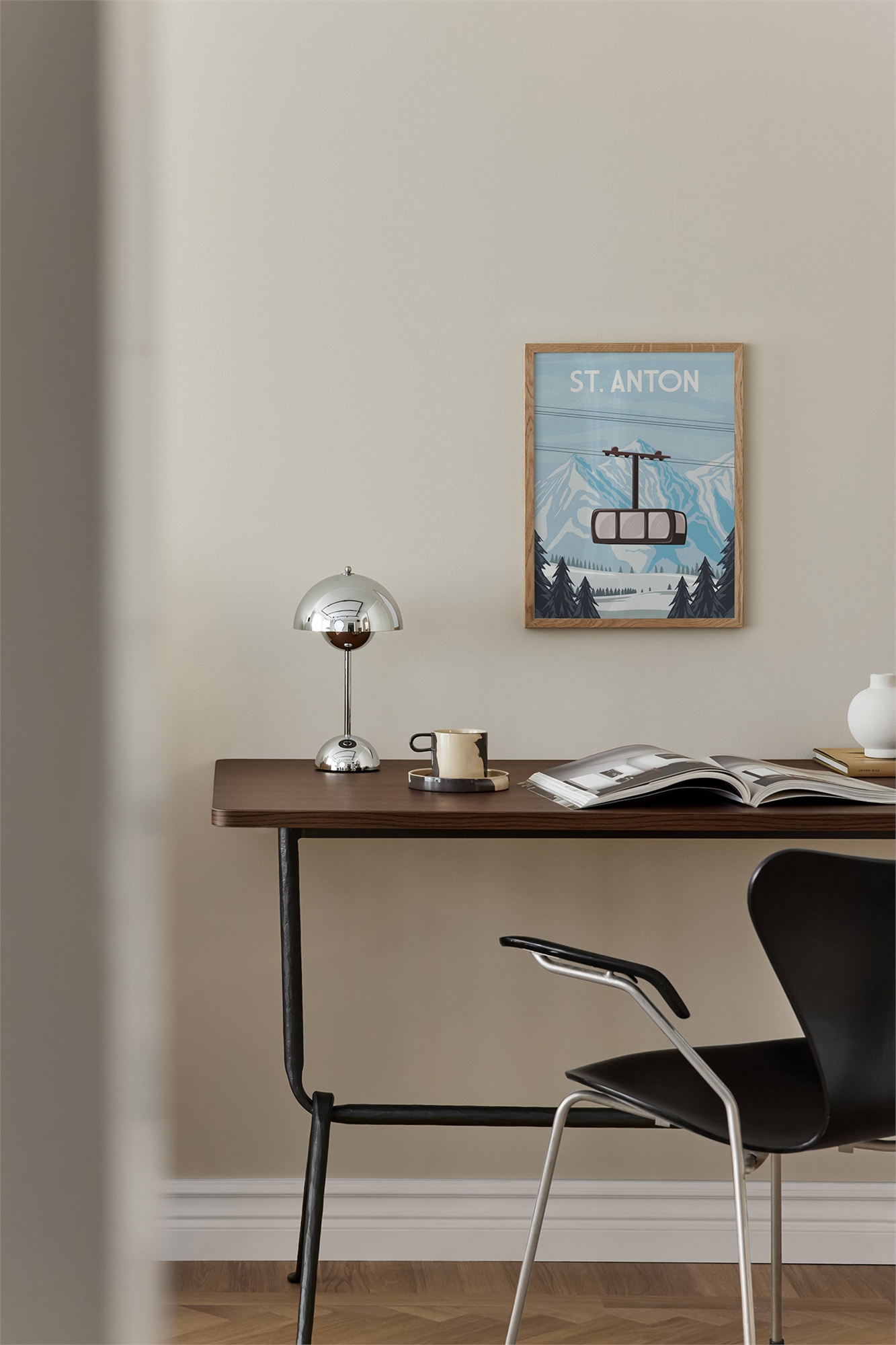 Иллюстрированный винтажный мотив канатной дороги с изображением альпийских гор на заднем плане. Над мотивом написано местоположение. На мотив нанесена небольшая поверхностная патина, что придает ему винтажный вид.