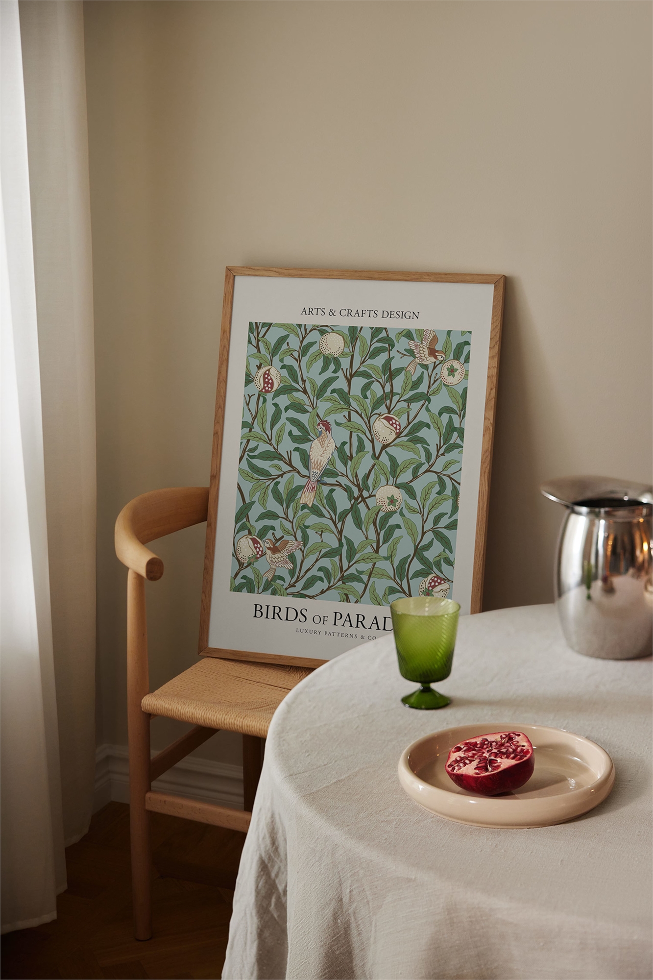 Иллюстрированный мотив с изображением птиц и зелени на голубом фоне. Над и под мотивом написан текст на английском языке. Иллюстрация обрамлена встроенным бежевым паспарту.