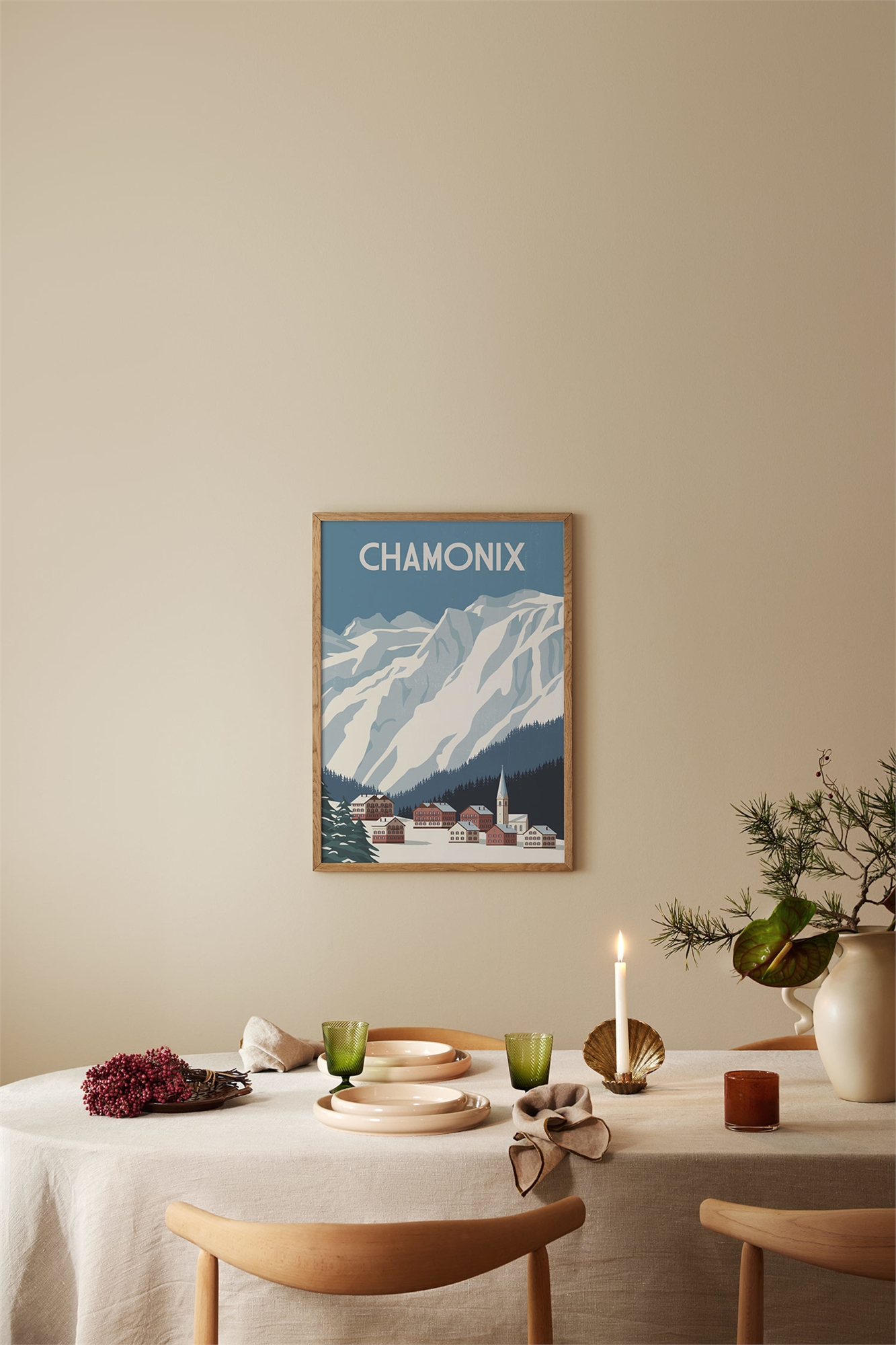 Иллюстрированный мотив домиков с изображением альпийских гор на заднем плане. Над мотивом написано местоположение. На мотив нанесена небольшая поверхностная патина, придающая ему винтажный вид.