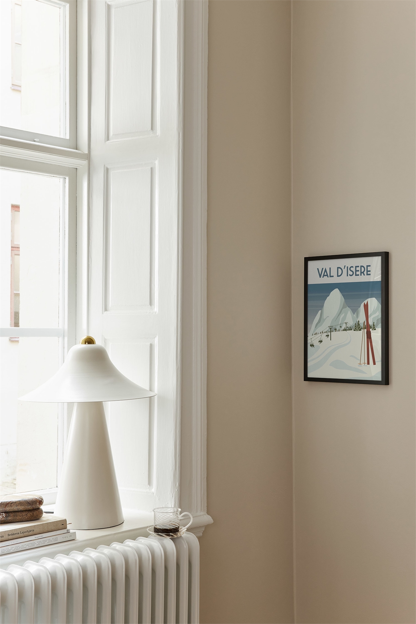 Иллюстрированный винтажный мотив лыж с заснеженной альпийской горой и подъемниками на заднем плане. Над мотивом написано местоположение. На мотив нанесена небольшая поверхностная патина, что придает ему винтажный вид.