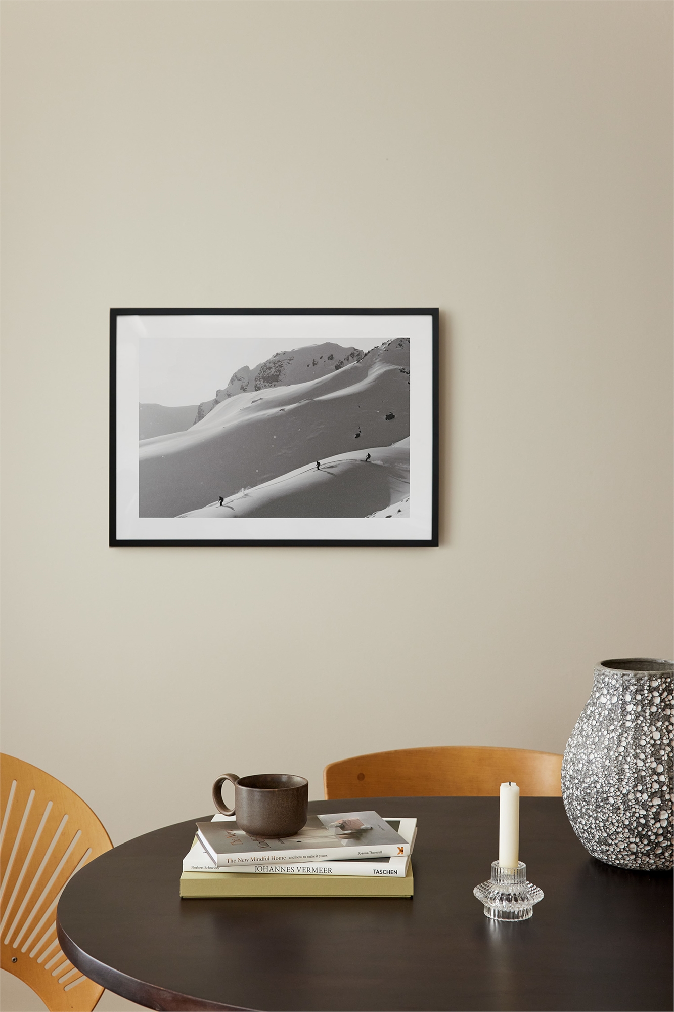 Черно-белая фотография людей, катающихся на лыжах по заснеженным склонам. Мотив обрамлен встроенным пассатижами.