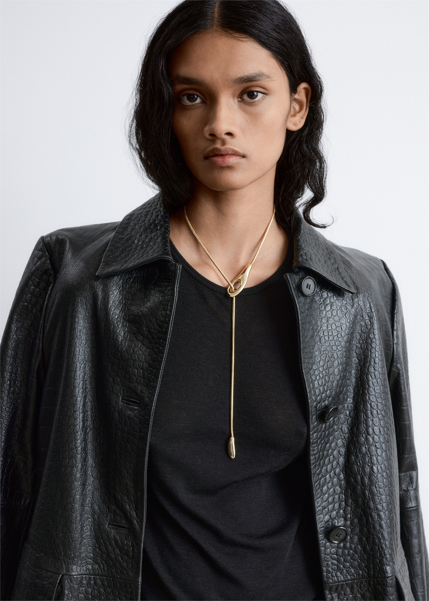 Изготовленное из полированной латуни, это ожерелье нанизано на тонкую змеиную цепочку с бусиной неправильной каплевидной формы на каждом конце. Одна бусина имеет центральный вырез, позволяющий продевать в него противоположный конец, образуя застежку в стиле лариата. Общая длина цепочки: 51 см / 20” Длина вырезанной бусины: 5 см / 2”
