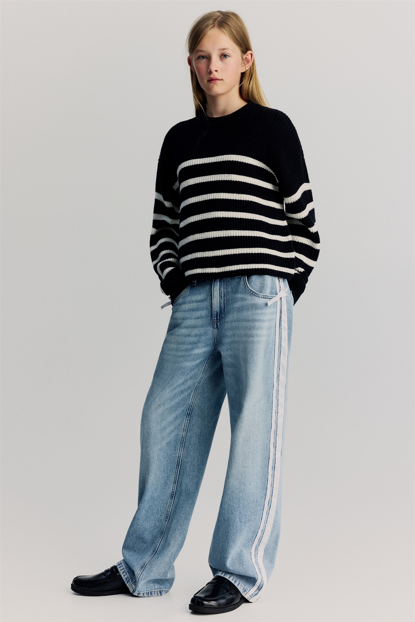 Джинсы с 5 карманами из моющегося хлопкового денима. Свободный крой по бедрам и ляжкам с опущенной промежностью и изогнутыми швами. Регулируемая резинка на талии и ширинка на молнии с пуговицей.
