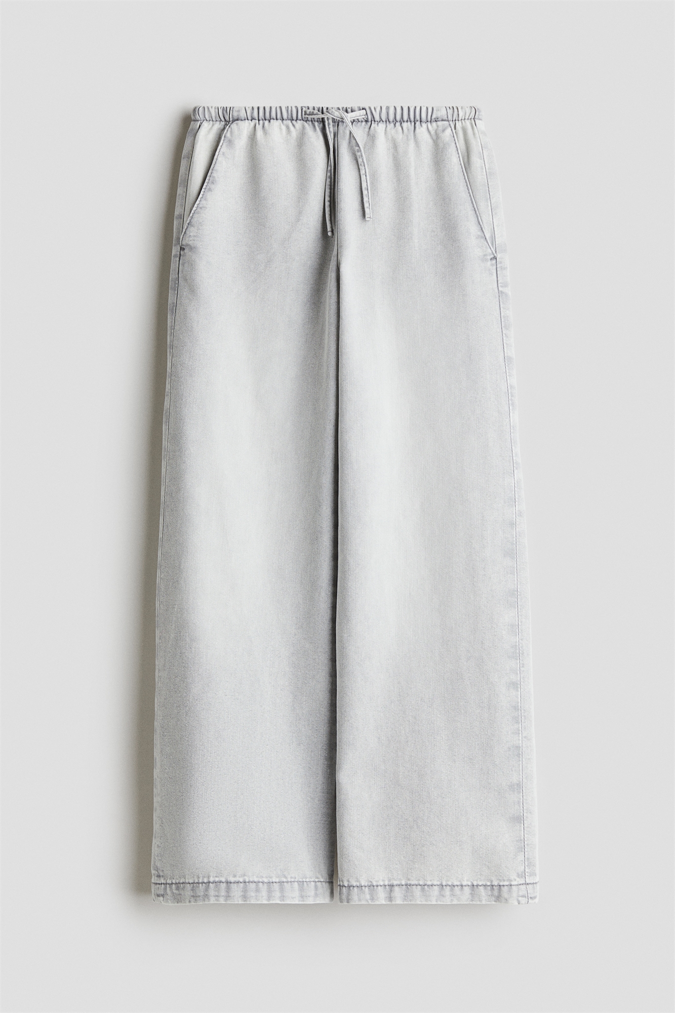 Джинсы из мягкого денима, изготовленного из смеси хлопка. Свободный крой по бедрам и ляжкам с широкими штанинами. Эластичный пояс с завязками и диагональные боковые карманы.
