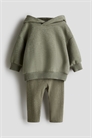 H&M Adorables. Комплект из высококачественного хлопка, состоящий из топа из толстовки с мягкой ворсистой внутренней стороной и леггинсов из мягкого ребристого трикотажа. Топ с капюшоном на подкладке, накинутым спереди, спущенными плечами, длинными рукавами и окантовкой на манжетах и подоле. Леггинсы с закрытой регулируемой резинкой на талии. Коллекция H&M Adorables - это подборка удобных и качественных вещей, не теряющих актуальности.