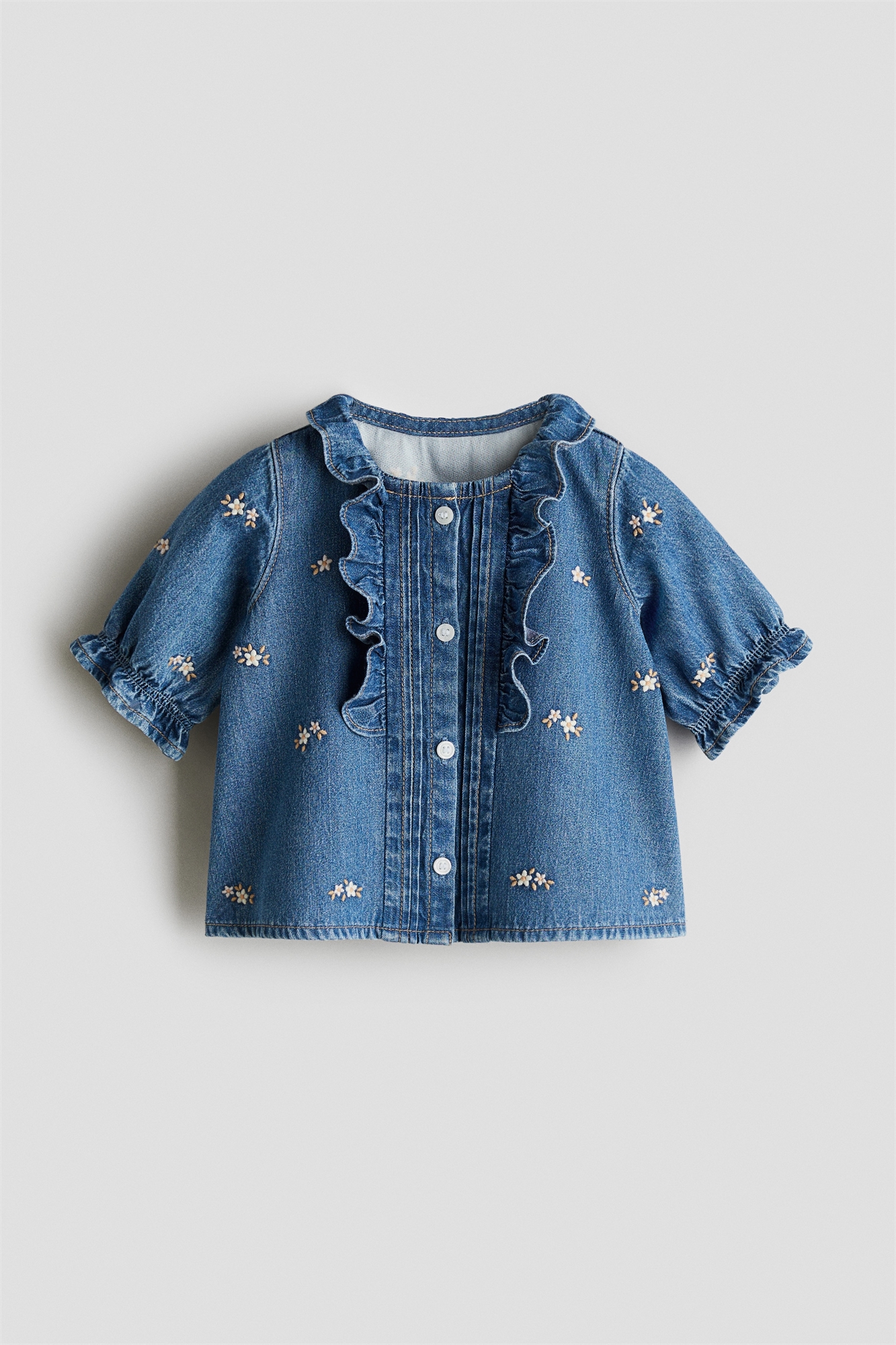 Блузка из мягкого хлопкового денима с вышитыми деталями. Круглый вырез с оборкой, продолжающейся спереди. Пуговицы и пинетки спереди, рукава 3/4 с эластичными манжетами с оборкой.