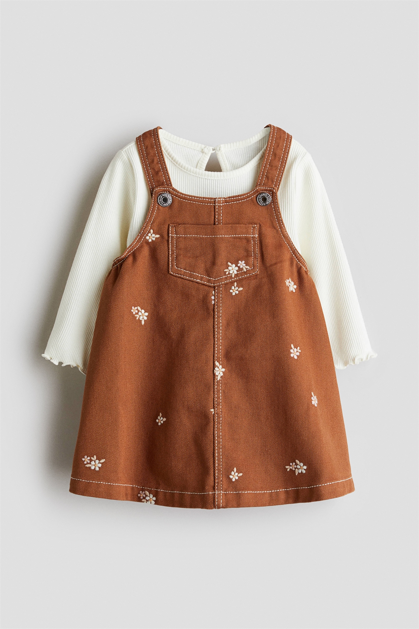 Хлопковый комплект, состоящий из топа из ребристого джерси и платья-дудочки из саржи. Топ с длинными рукавами, круглым вырезом, отверстием для ключа и пуговицей сзади, а также оверлоками на манжетах и подоле. Платье-одеяло с регулируемыми бретелями, застежкой на кнопки и накладным нагрудным карманом.