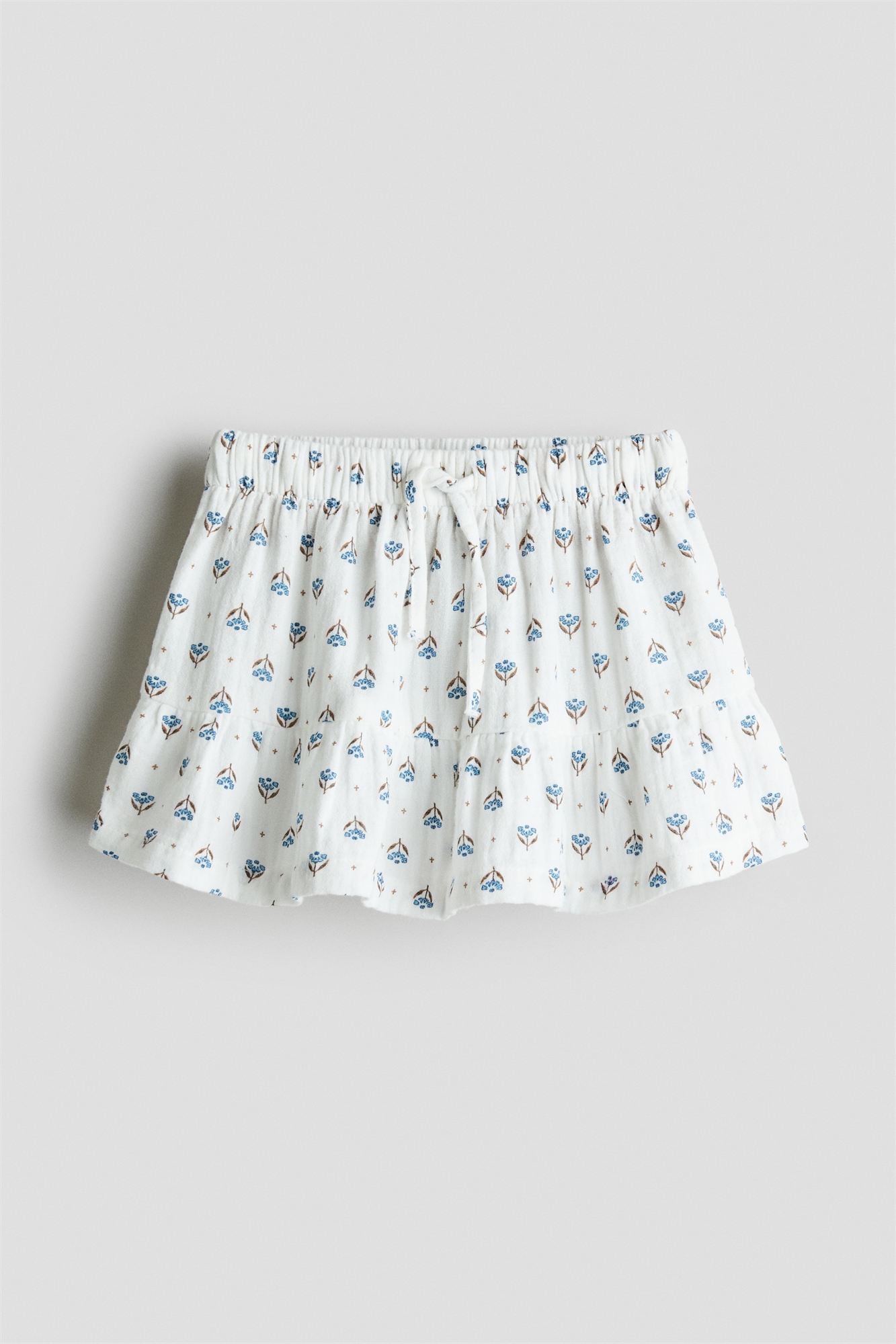 Расклешенная юбка из мягкого хлопкового муслина с принтом по всему периметру, эластичным поясом с завязками и широким подолом.