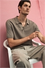 Рубашка-поло из мягкого кабельного трикотажа из хлопковой смеси с воротником, застежкой на пуговицы, короткими рукавами и прямым подолом. Ребристая отделка на манжетах и подоле. Зауженный крой, облегающий контуры тела и создающий приталенный силуэт.