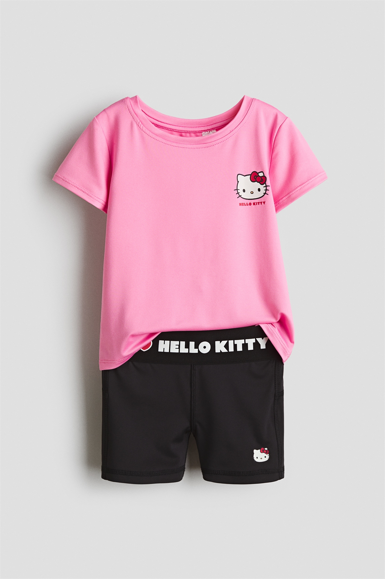 Комплект спортивной одежды из футболки и велосипедных шорт из быстросохнущей функциональной ткани. Футболка с узкой окантовкой по вырезу горловины и манжетам и принтом спереди. Велошорты с плоскими швами, широким эластичным поясом и принтом спереди.