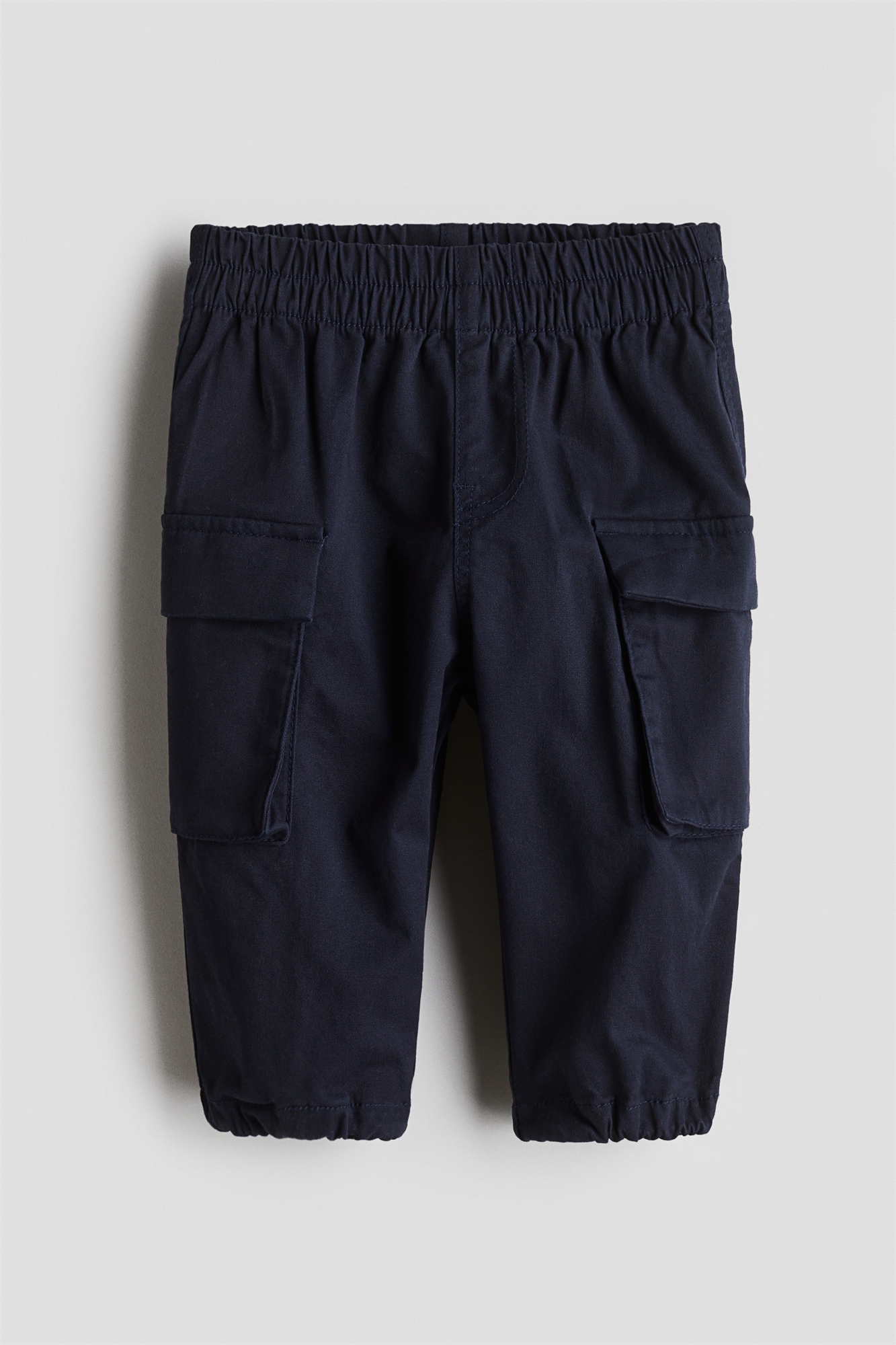 Брюки-карго из мягкого хлопка с эластичным поясом, фальшивой ширинкой, накладными карманами на ногах и эластичной отделкой по краям.