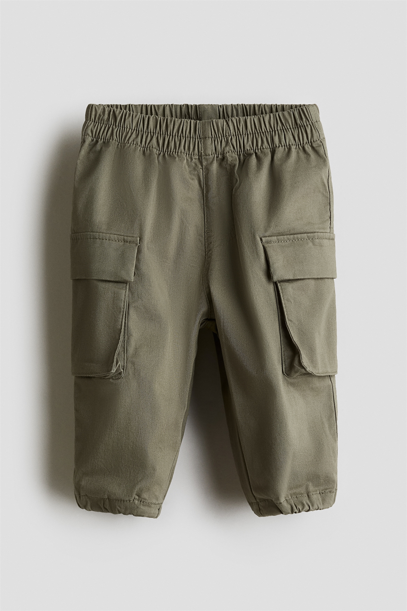 Брюки-карго из мягкого хлопка с эластичным поясом, фальшивой ширинкой, накладными карманами на ногах и эластичной отделкой по краям.