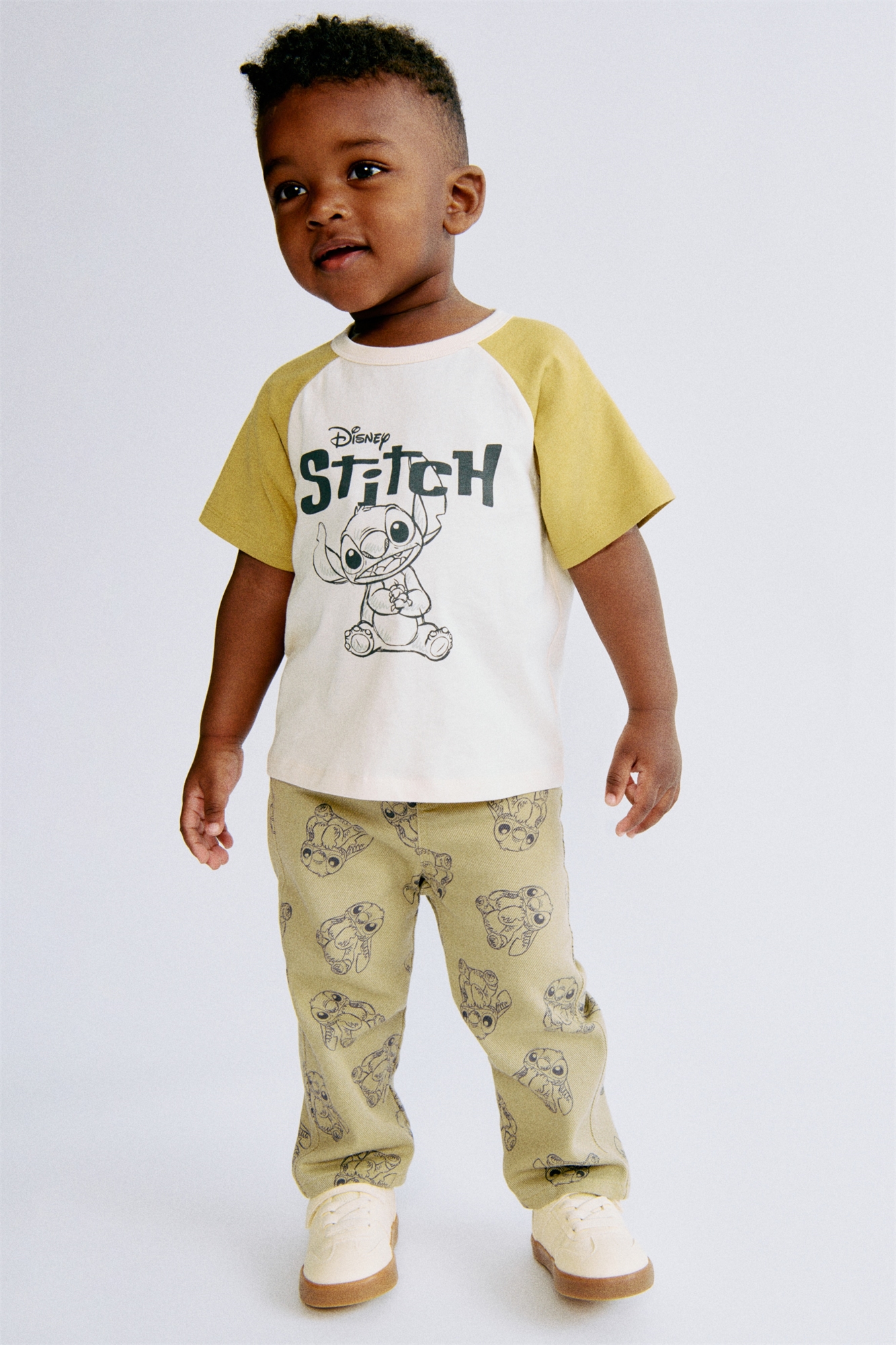 Брюки с 5 карманами из мягкой хлопковой саржи с принтом по всей длине. Регулируемый эластичный пояс с фальшивой ширинкой и кнопкой.