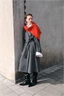 Пальто длиной до колена из смеси шерсти и войлока. Шалевый воротник, съемный пояс-завязка на талии и карманы в боковых швах. Спущенные плечи и один вентиляционный канал на спине. Без подкладки.