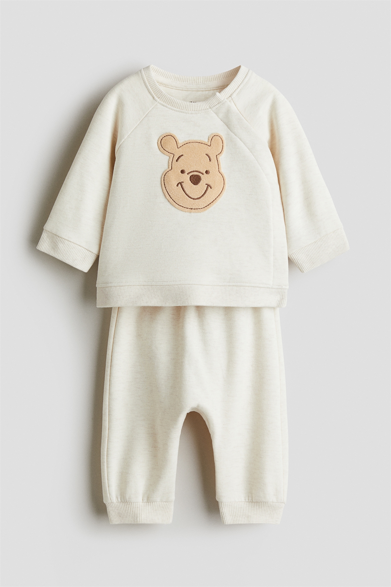 Комплект из топа и джоггеров из толстовки с мягкой ворсистой внутренней стороной. Топ с аппликацией спереди, круглым вырезом с ребристой отделкой и направленной вперед проймой с кнопками на одном плече. Длинные рукава реглан и окантовка манжет и подола. Джоггеры с утяжкой на талии и ребристой отделкой по подолу.