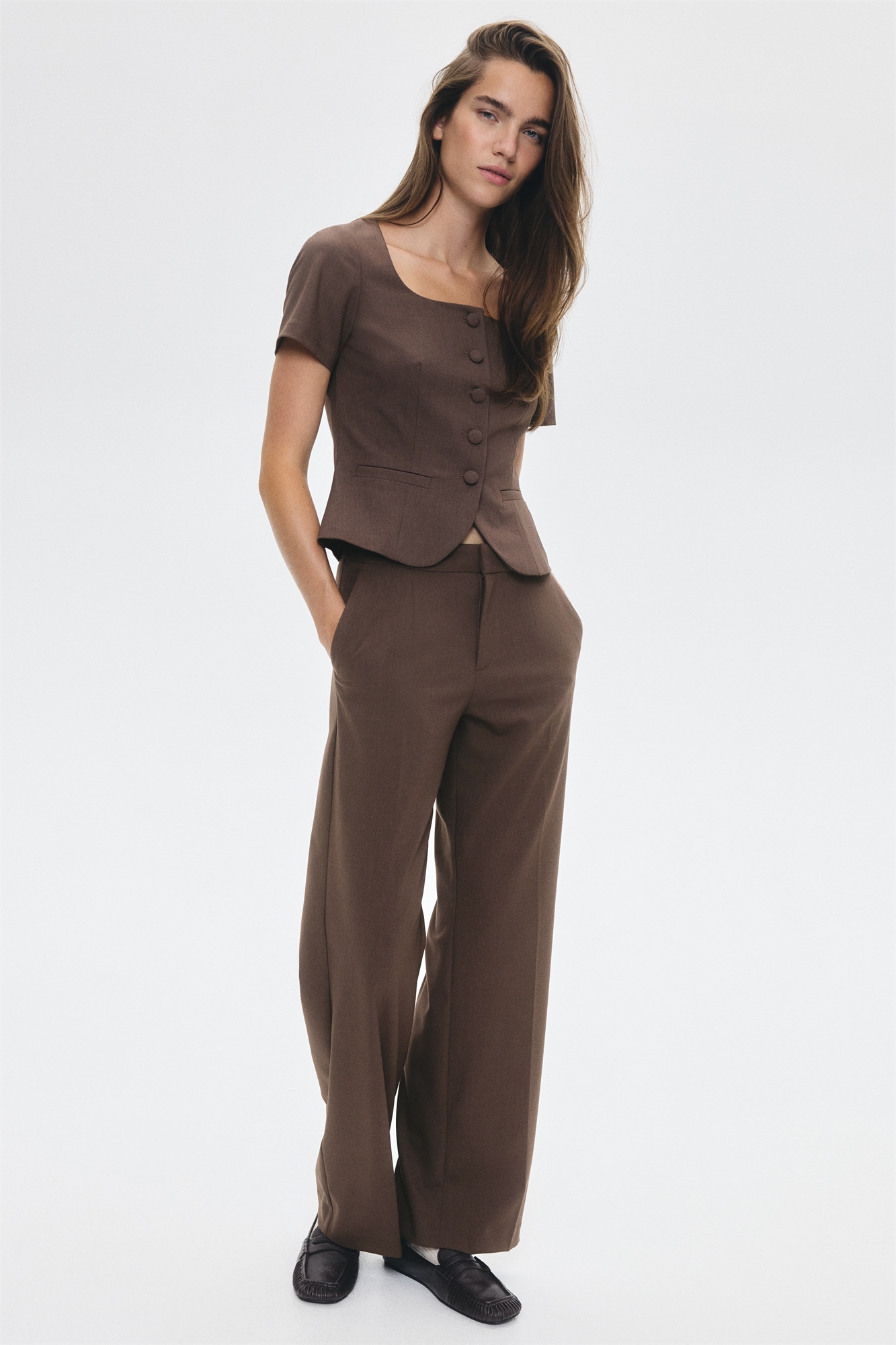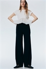 Приталенные брюки из тканого материала с высокой талией, ширинкой на молнии и скрытыми застежками на пуговицы и крючки. Диагональные боковые карманы и прямые ноги со складками спереди и сзади.