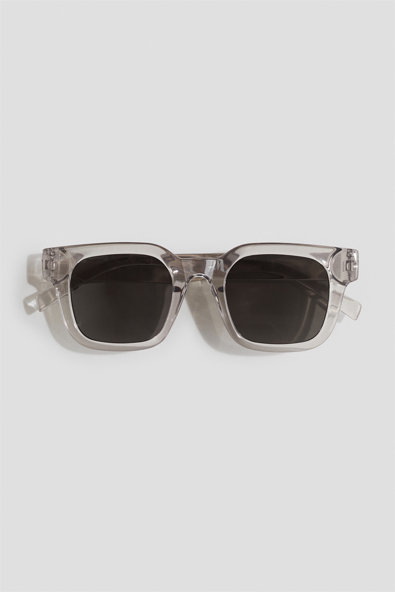 Прямоугольные солнцезащитные очки с прозрачной оправой из пластика и тонированными пластиковыми линзами с УФ-защитой.
