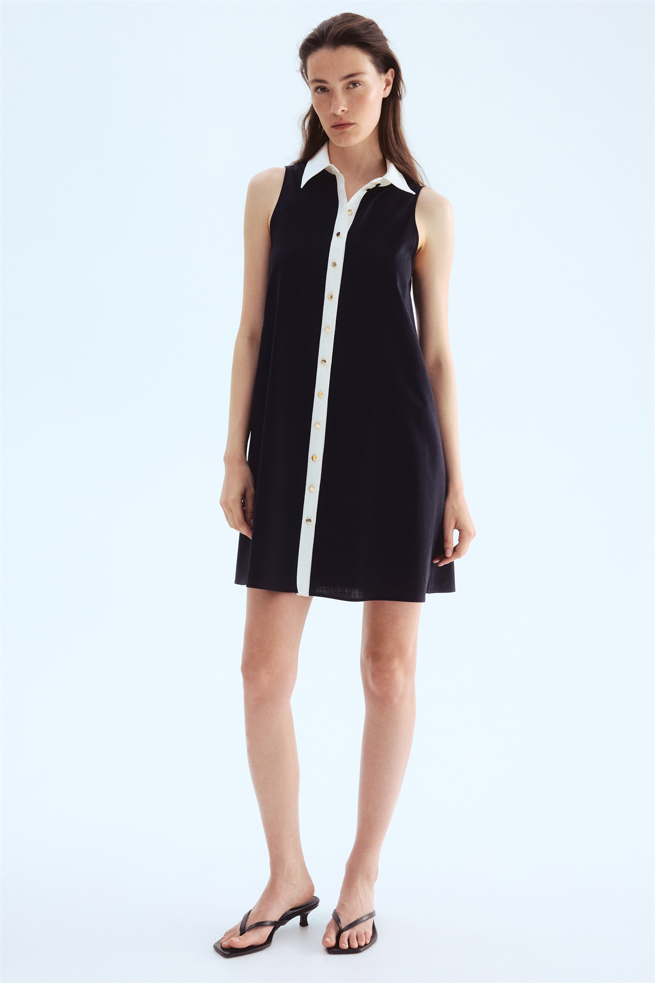 Короткое платье-рубашка без рукавов из воздушного хлопка и вискозы с воротником и пуговицами золотого цвета спереди. А-линия силуэта с нагрудными вытачками и прямым покроем подола. Без подкладки.