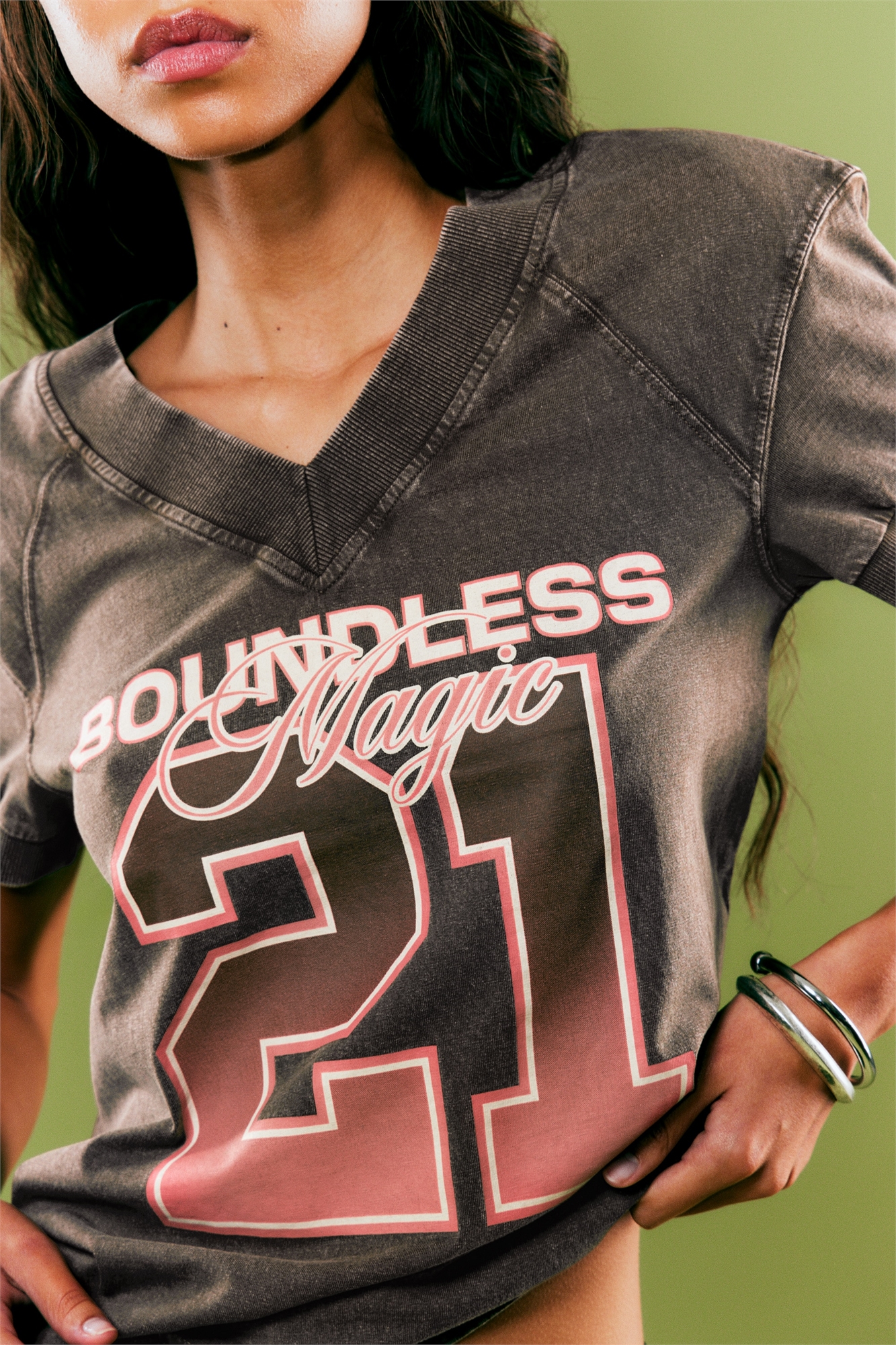 Футболка с V-образным вырезом из мягкого хлопкового джерси с эффектом винтажной стирки. Футболка с короткими рукавами и швами реглан украшена контрастным принтом в духе варшавского стиля спереди и легкой затяжкой на подоле рукава для придания объема.