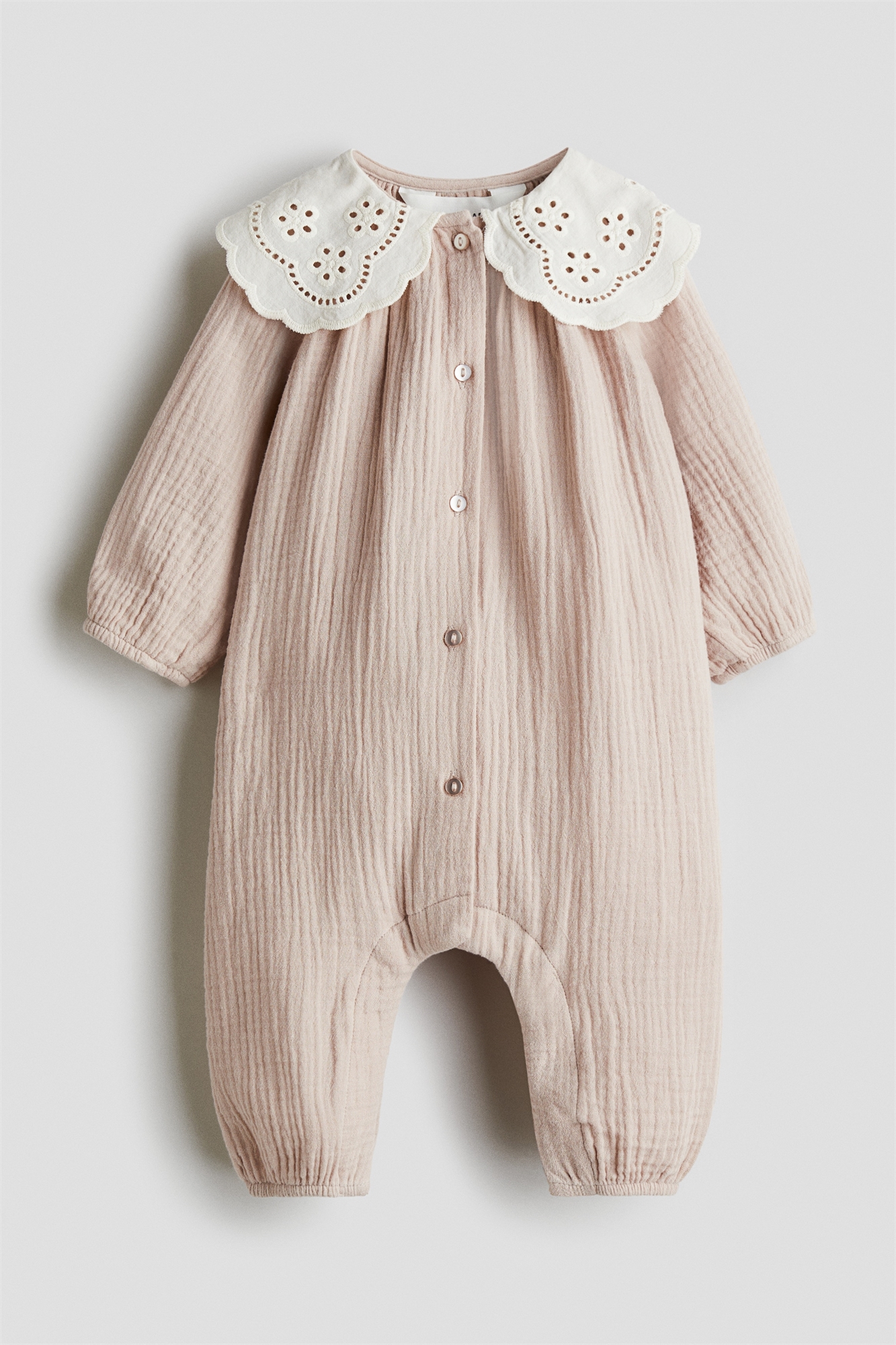 H&M Adorables. Ромпер из мягкого муслина, изготовленного из высококачественного хлопка, с воротником-стоечкой из тканого материала с рисунком broderie anglaise. Пуговицы спереди, длинные рукава и длинные ножки с потайными кнопками для удобства переодевания. Узкая эластичная резинка на манжетах и подол. Коллекция H&M Adorables - это подборка удобных и качественных вещей, не теряющих актуальности.