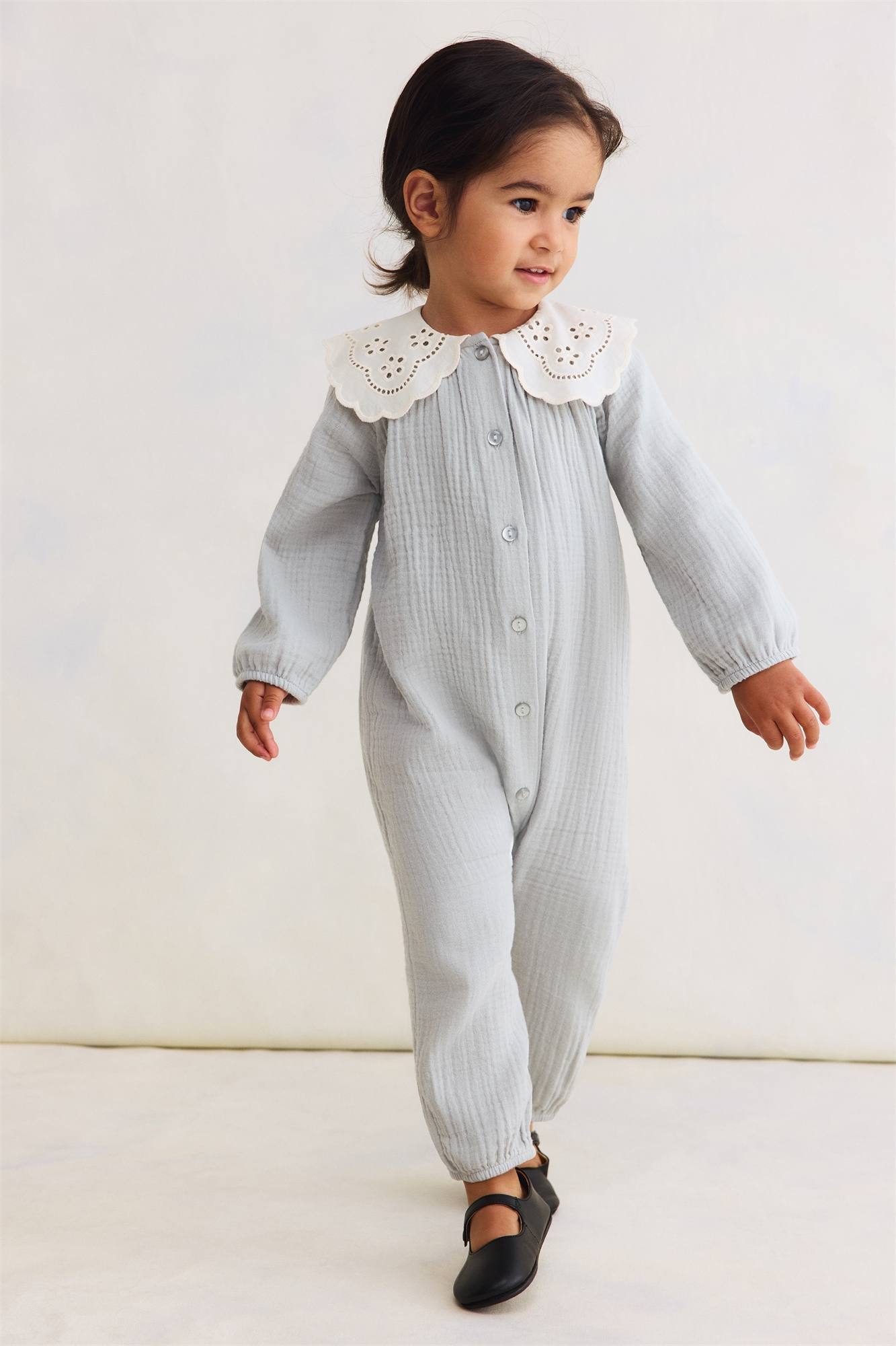 H&M Adorables. Ромпер из мягкого муслина, изготовленного из высококачественного хлопка, с воротником-стоечкой из тканого материала с рисунком broderie anglaise. Пуговицы спереди, длинные рукава и длинные ножки с потайными кнопками для удобства переодевания. Узкая эластичная резинка на манжетах и подол. Коллекция H&M Adorables - это подборка удобных и качественных вещей, не теряющих актуальности.