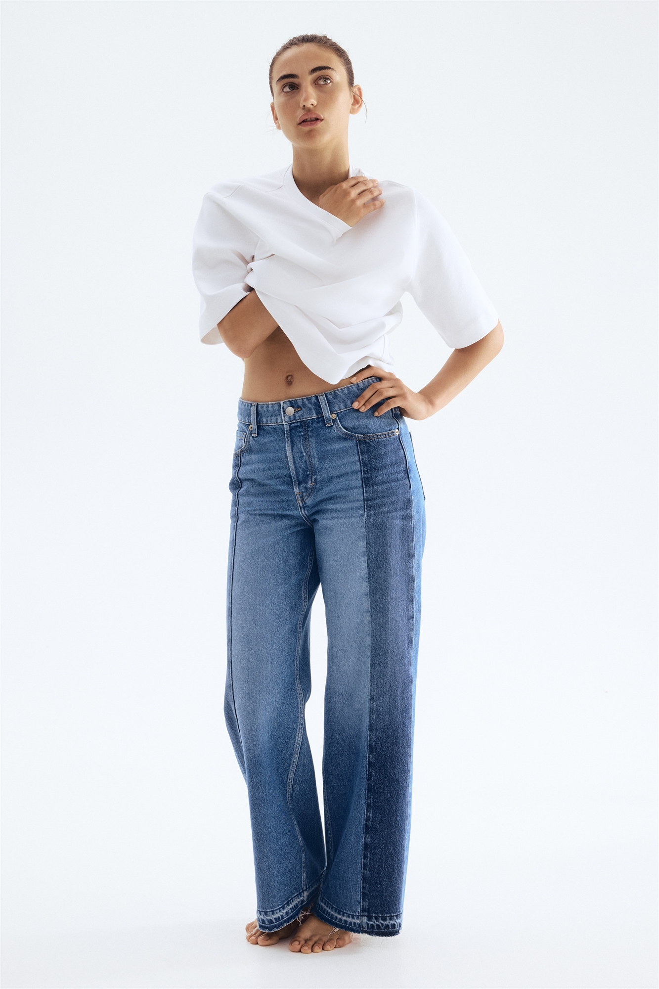 Джинсы с 5 карманами из жесткого хлопкового денима, который сначала кажется упругим, но затем смягчается и ослабевает при носке. Широкие штанины со свободной посадкой от талии до бедра и широким кроем от бедра до подола. Регулярная талия с ширинкой на пуговицах, панелями темного тона по передней части ног и необработанными краями. Удлиненная длина, созданная для того, чтобы ниспадать по ноге с эффектом укладки. Непринужденная и прохладная джинсовая одежда.