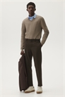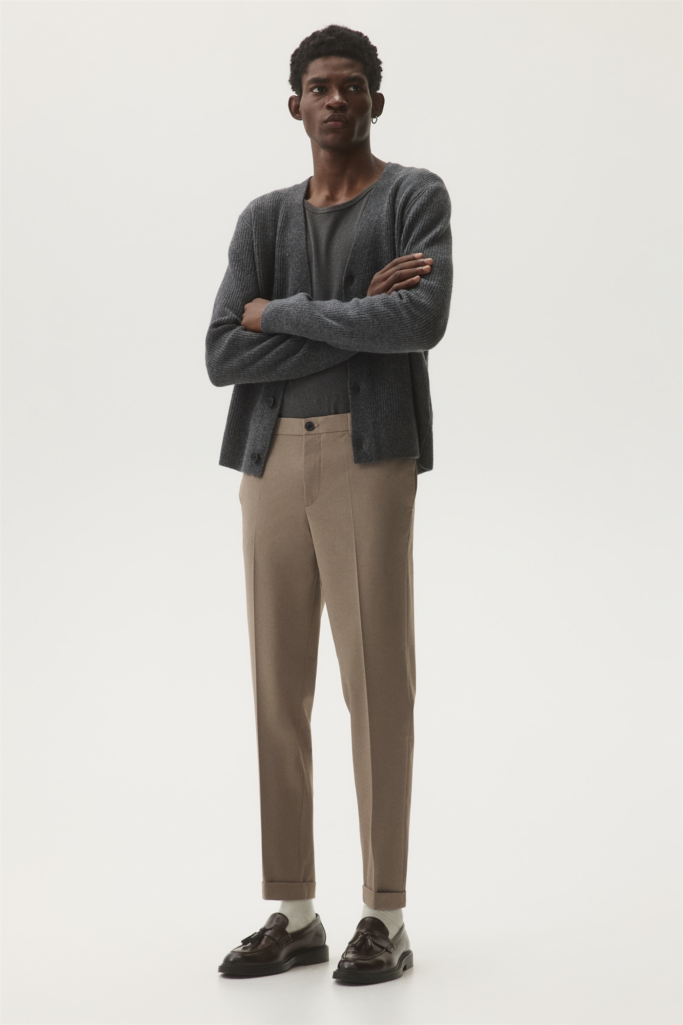 Приталенные брюки из мягкой ткани с ширинкой на молнии и пуговице, боковыми карманами и накладными задними карманами с пуговицей. Зауженные ноги со складками. Зауженный крой, облегающий контуры тела и создающий приталенный силуэт.