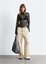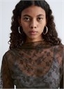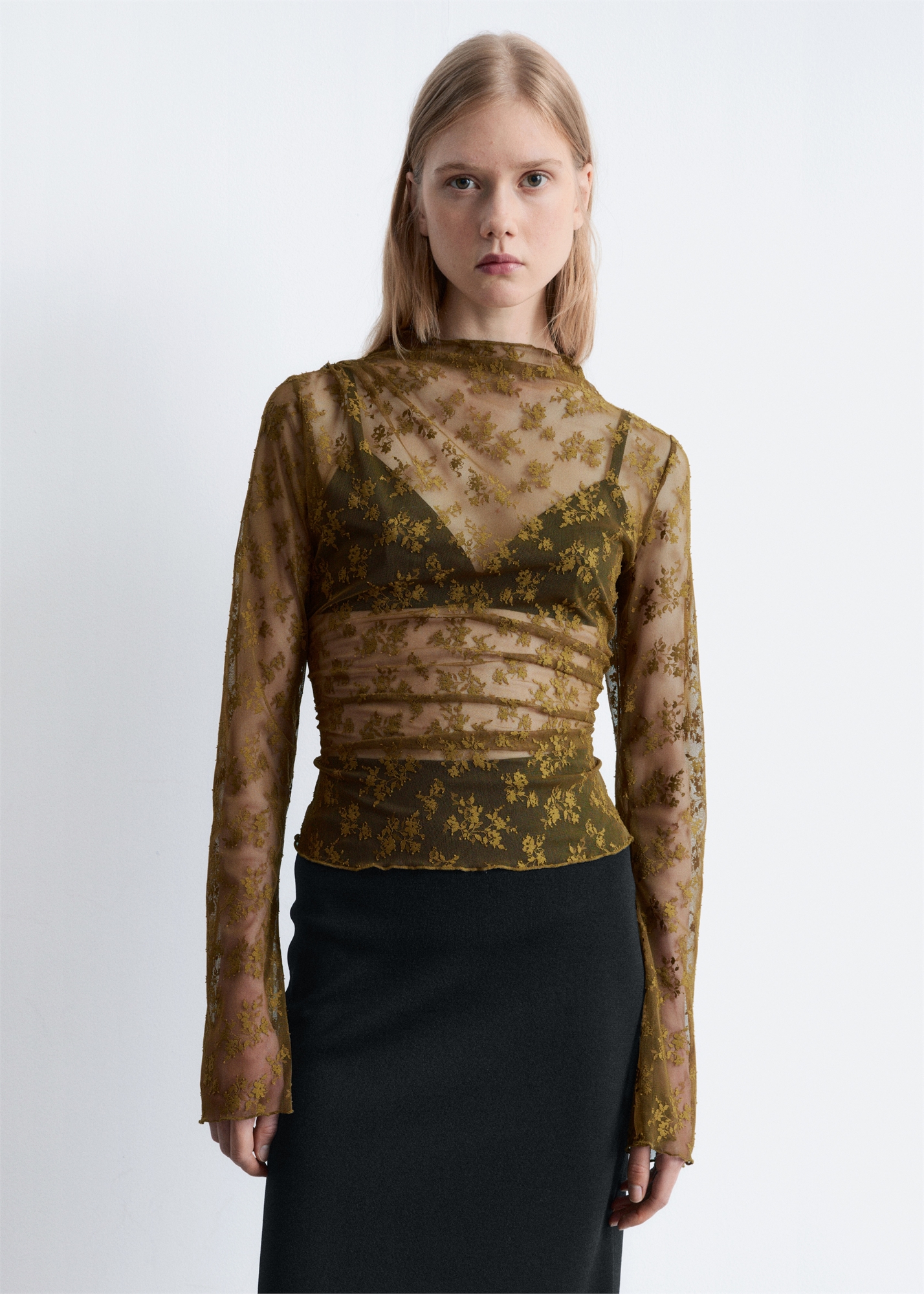 Этот топ изготовлен из нежного кружева с декоративным цветочным узором. Он имеет облегающий силуэт, горловину, длинные рифленые рукава и сборки на плечах и талии. Длина топа: 56 см / 22 дюйма (размер S)