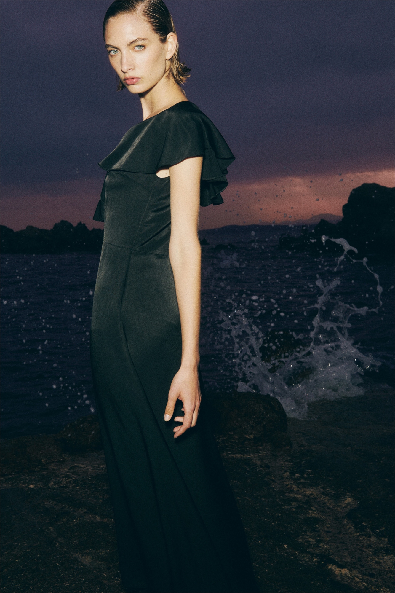 Приталенное платье длиной до колен из тканого материала с легким блеском. Глубокий V-образный вырез спереди и сзади с широким воланом по всему периметру. Потайная застежка-молния с одной стороны и расклешенная юбка. Без подкладки.