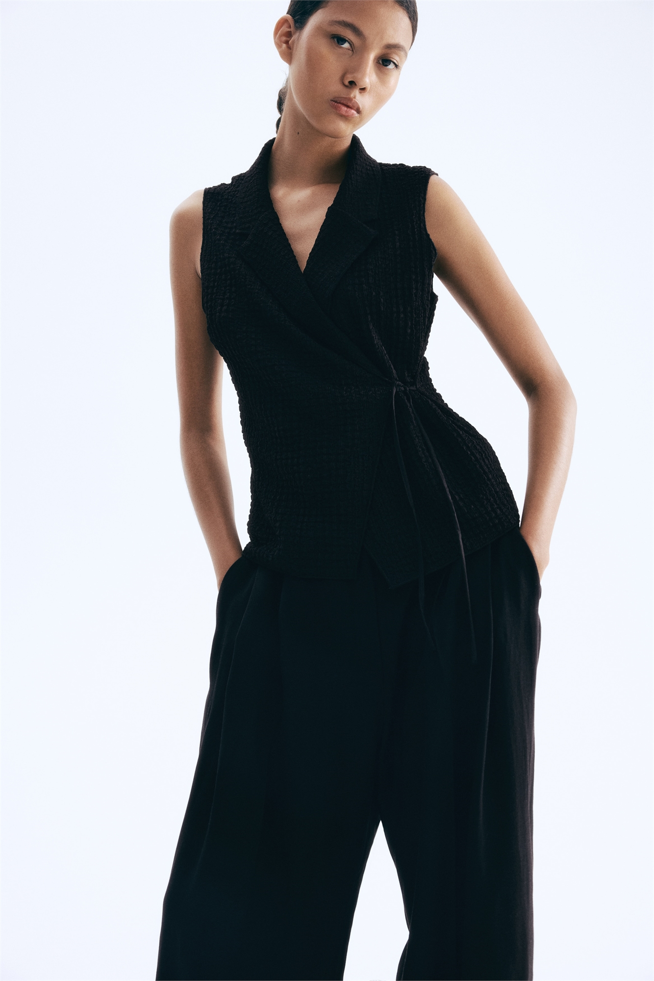 Приталенный жилет из фактурного джерси с лацканами с вырезом и облегающим передом с узкими завязками с одной стороны талии.