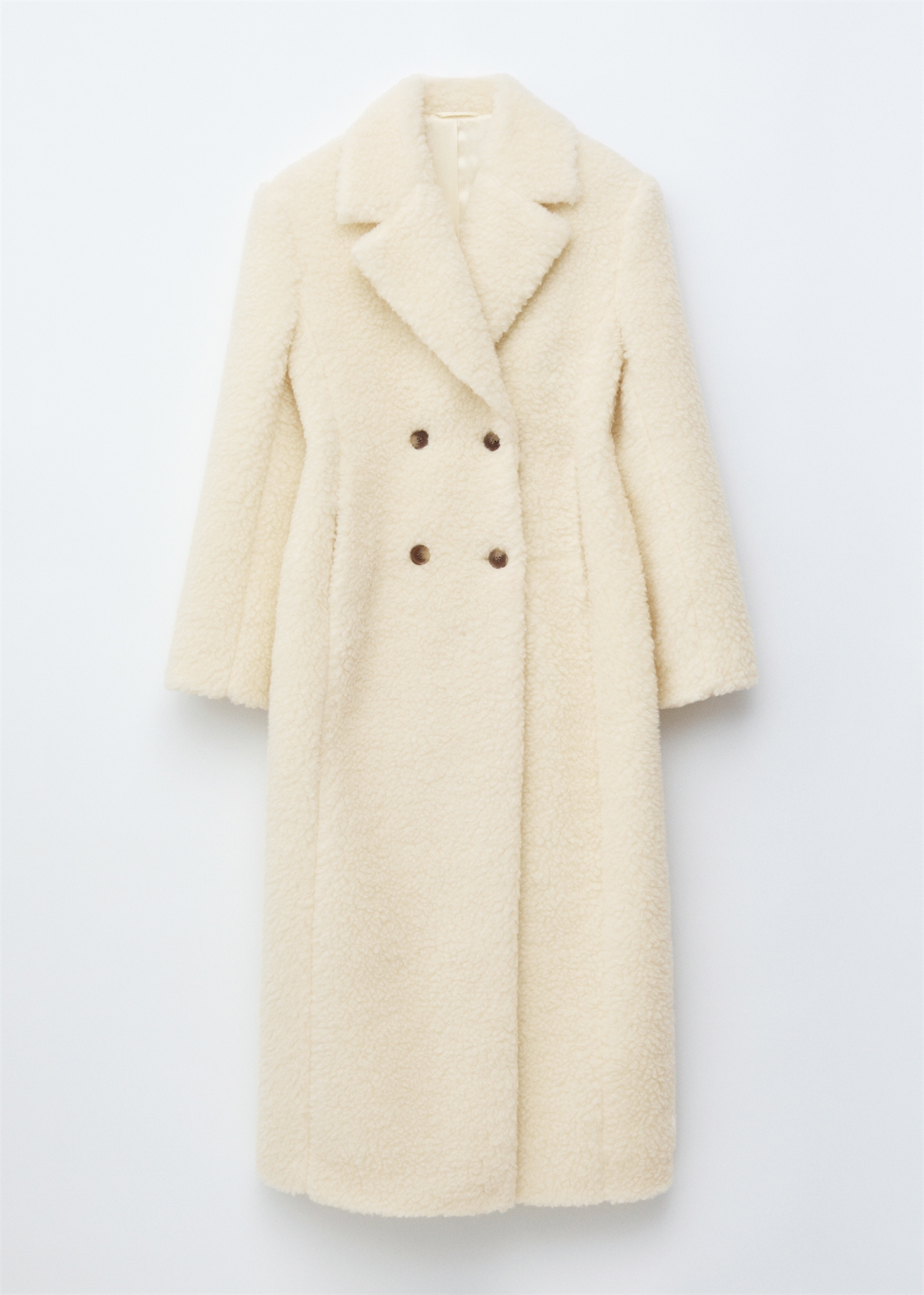 Двубортное пальто макси из мягкой, плюшевой шерсти Shearling с фигурной талией, широкими лацканами с вырезом и структурированными подплечниками. Модель дополнена притачными швами, высоким вентиляционным отверстием на заднем подоле и застежкой на четыре пуговицы. 67% шерсти RWS TE-00047206 Длина пальто: 131 см / 51,6" (размер S)