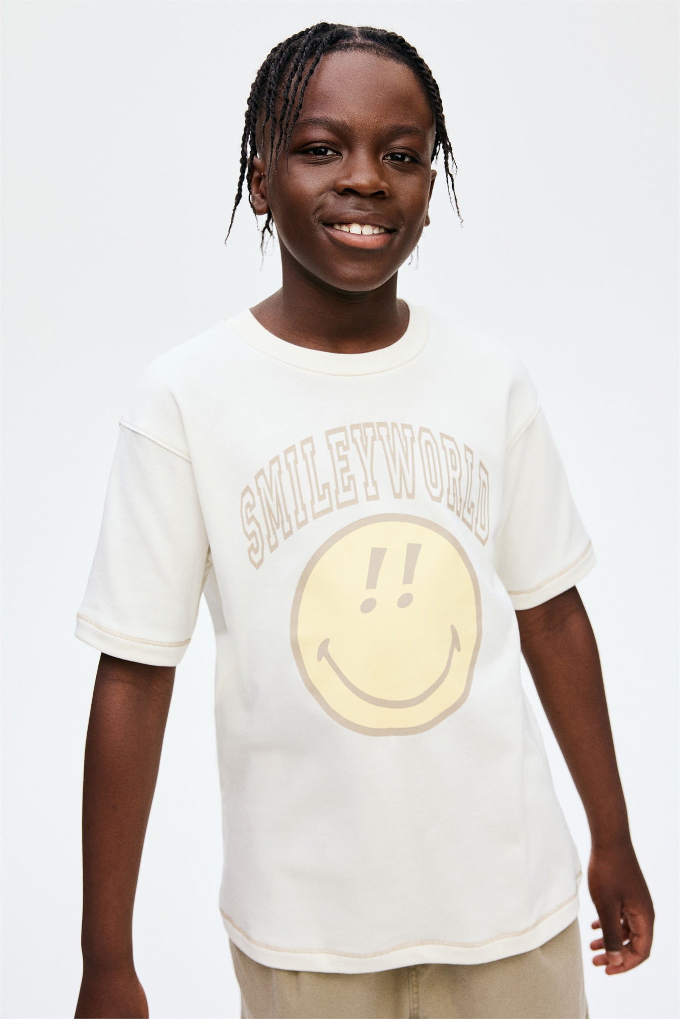 Свободная футболка из легкой толстовочной ткани с принтом. Круглый вырез с ребристой отделкой и спущенные плечи.