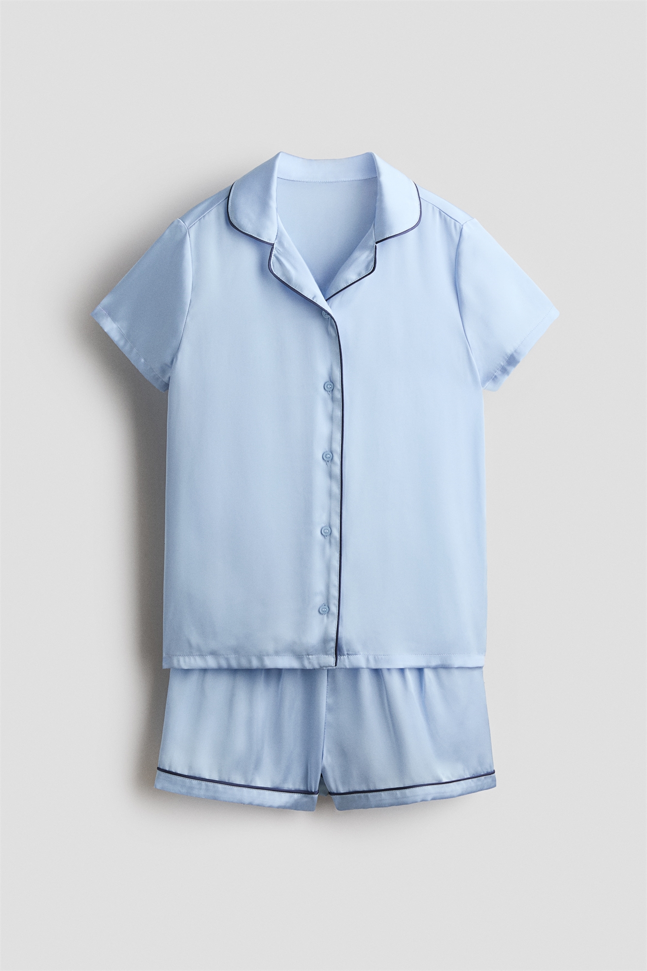 Пижама с рубашкой и шортами из мягкого сатина с принтом на всю длину. Рубашка с короткими рукавами, воротником и пуговицами спереди. Шорты с эластичной резинкой на талии.