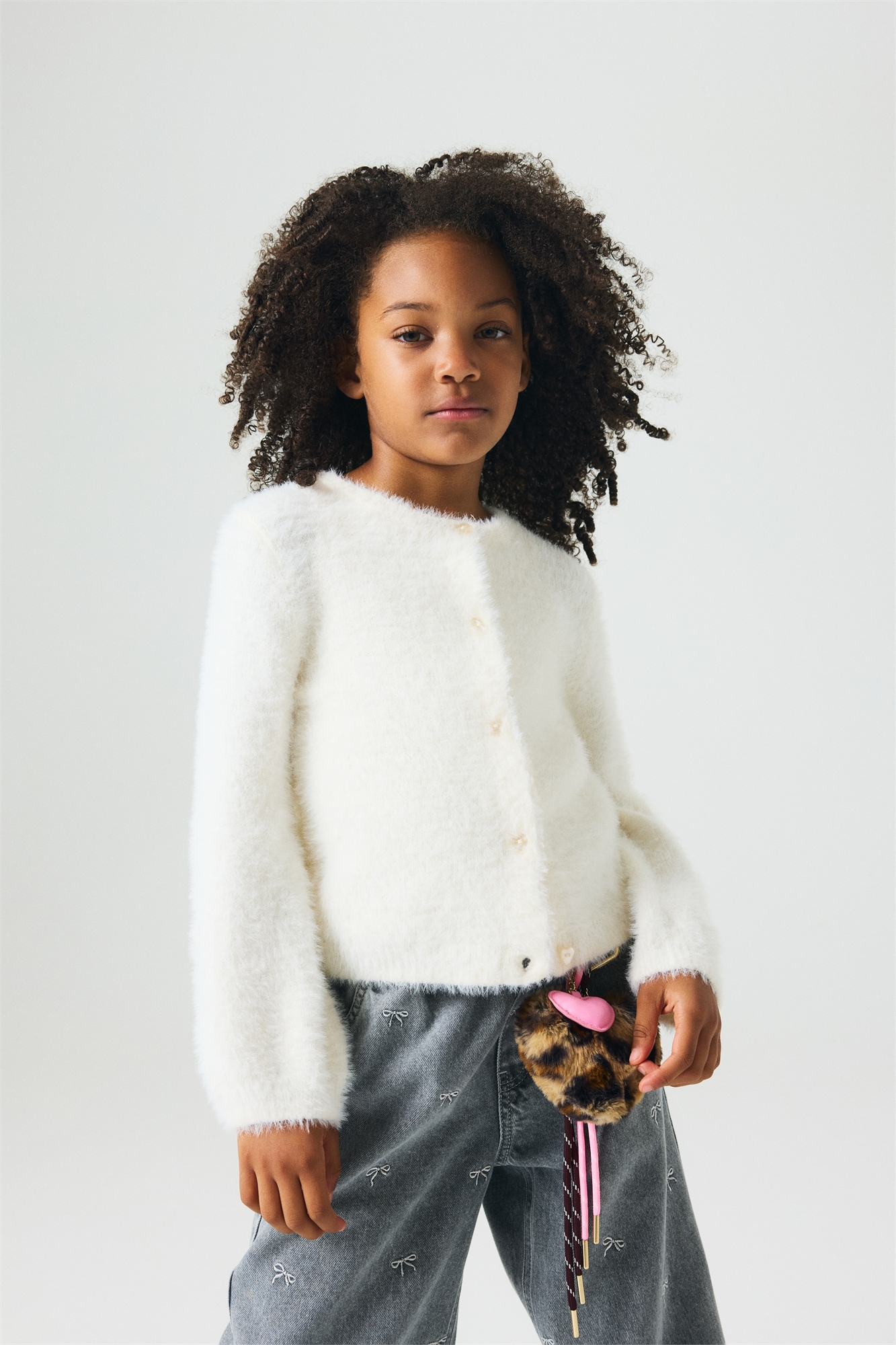 Кардиган из мягкого пушистого трикотажа. Круглый вырез с ребристой отделкой, пуговицы спереди и длинные рукава-баллон. Ребристые манжеты и подол.