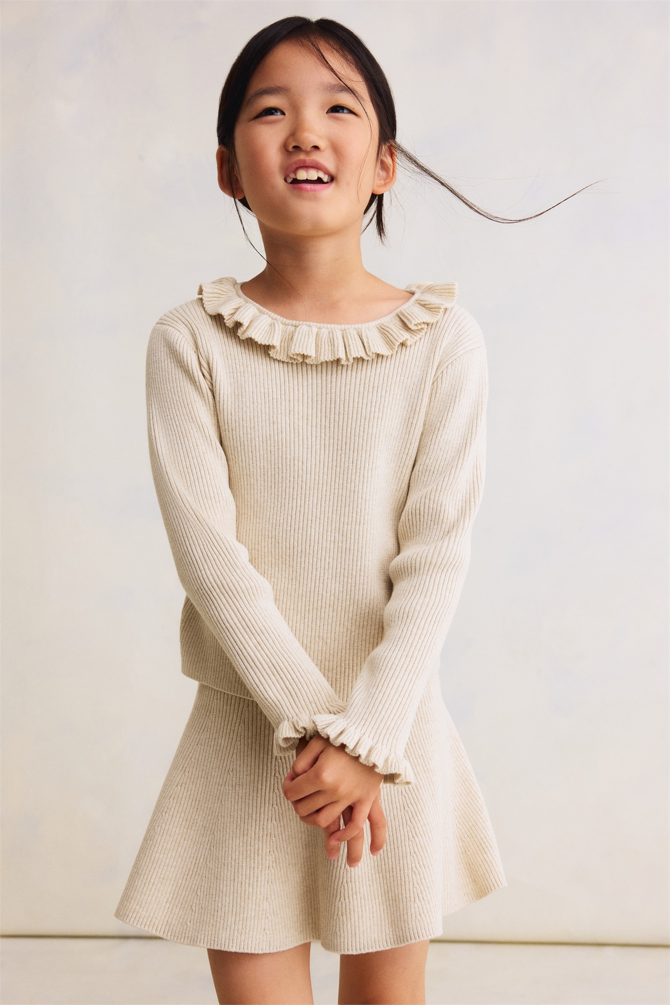 H&M Adorables. Комплект из топа и юбки из мягкого трикотажа в рубчик, изготовленного из высококачественного хлопка. Топ с круглым вырезом с окантовкой и длинными рукавами с окантованными манжетами. Расклешенная юбка со скрытой, регулируемой резинкой на талии. Коллекция H&M Adorables - это подборка удобных и качественных вещей, не теряющих актуальности.