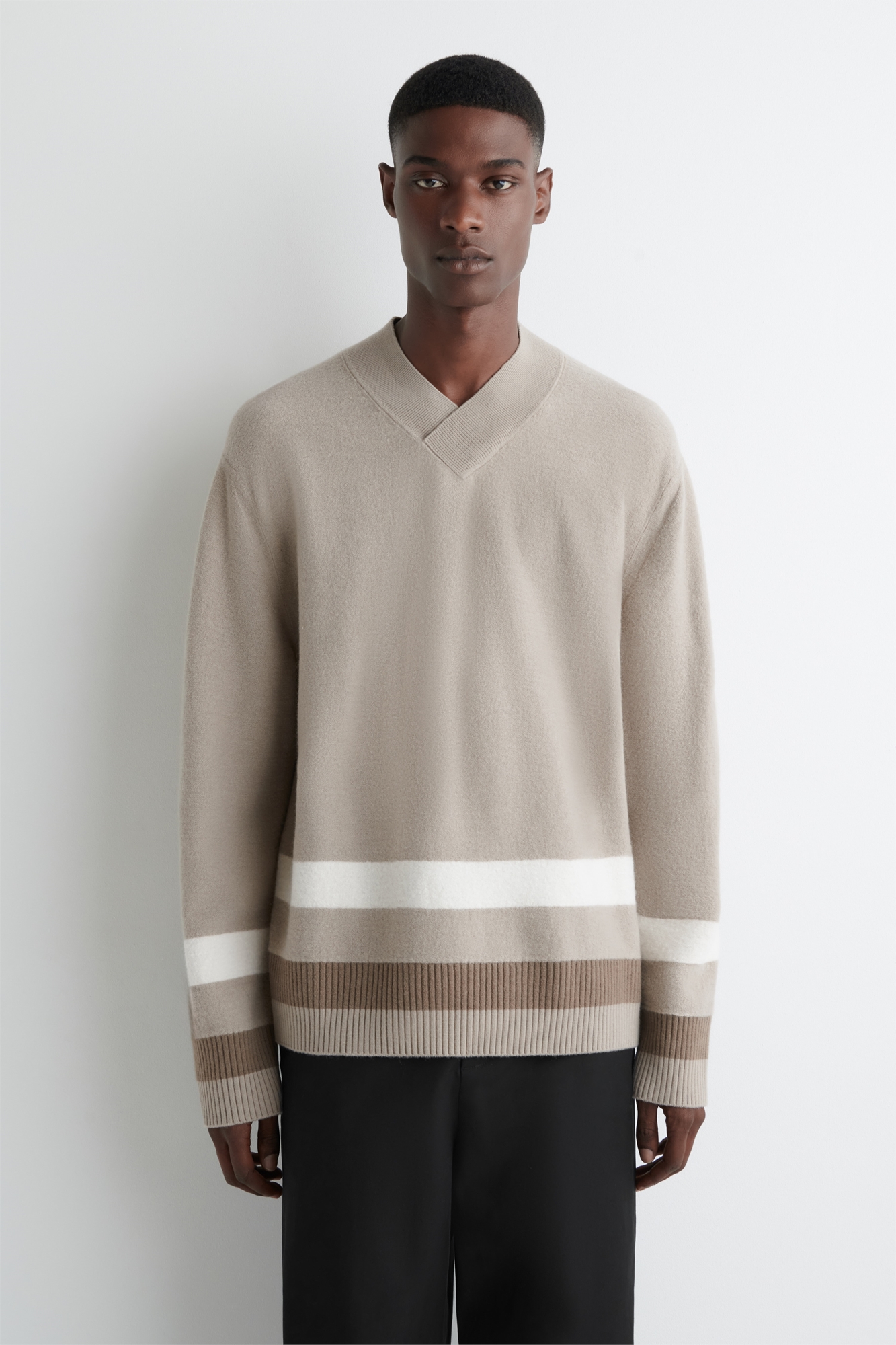 Классический полосатый джемпер обновлен для сезона осень-зима 2025. Этот джемпер с V-образным вырезом изготовлен из первоклассной мериносовой шерсти, сваренной для придания тактильных ощущений, и украшен контрастными полосками на подоле. Сочетайте ее с простыми джинсами. Свободный кройЭто изделие содержит шерстяное волокно Responsible Wool Standard TE-00047206 (RWS) с ферм, сертифицированных в соответствии с требованиями к благополучию животных и управлению земельными ресурсами Материал: 100% мериносовая шерсть. Без учета отделки / Сухая чистка Длина по спинке для размера M составляет 66,6 см / Модель носит размер M