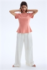 Облегающий топ из плотного трикотажа интерлок с круглым вырезом и короткими рукавами. Формирующие вытачки на талии и расклешенный подол.