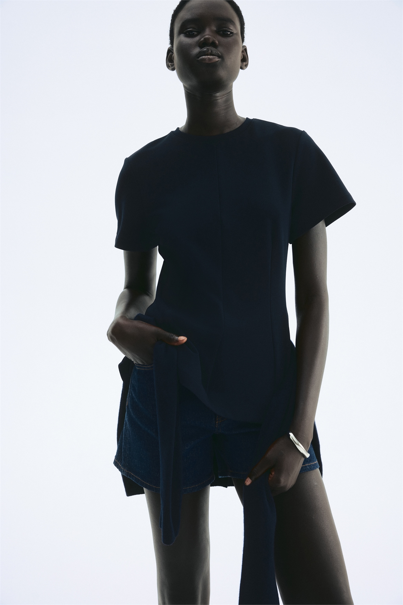 Облегающий топ из плотного трикотажа интерлок с круглым вырезом и короткими рукавами. Формирующие вытачки на талии и расклешенный подол.