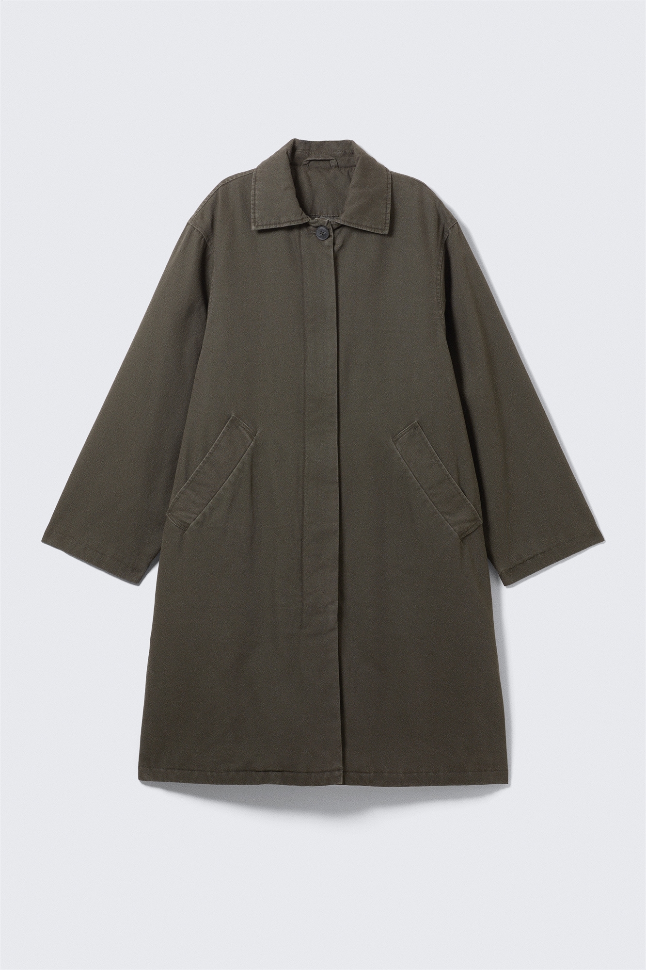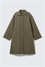 Свободно сидящее автомобильное пальто с чистым, утилитарным видом. Изготовленное из хлопкового холста, оно имеет скрытую двустороннюю застежку-молнию и одну верхнюю пуговицу на воротнике. Полностью на подкладке и с мягкой подкладкой по всему телу, с боковыми карманами и внутренним нагрудным карманом. Длина до колена, минимальный силуэт, который легко надевается.
