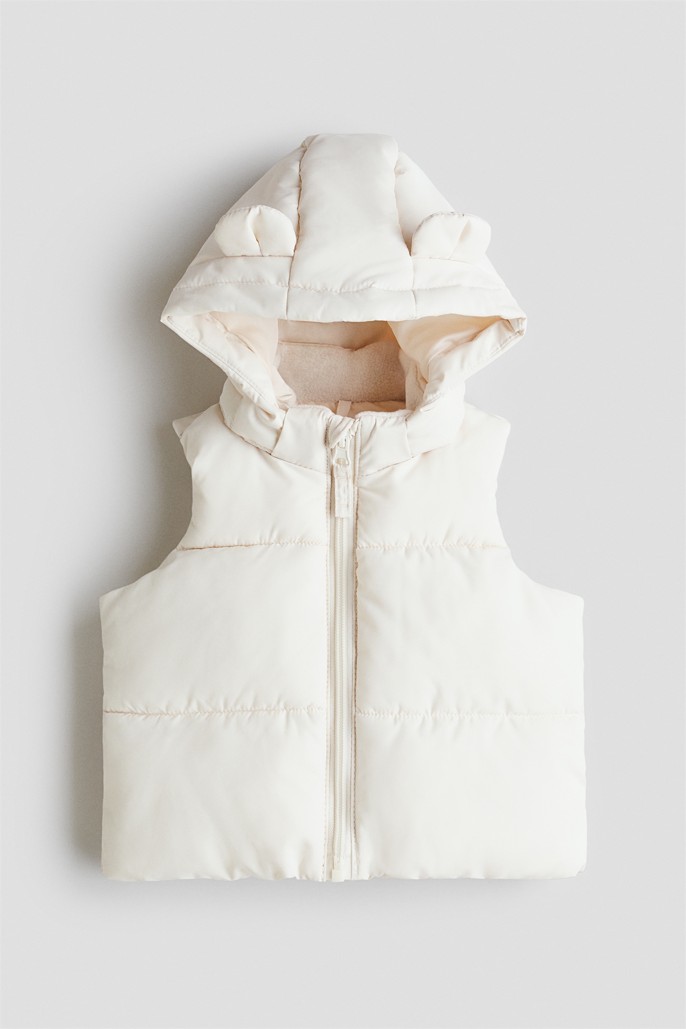 Пуховик с мягкой подкладкой и съемным капюшоном с аппликацией в виде ушей. Воротник-стойка и застежка-молния спереди с защитой подбородка от натирания. На подкладке.