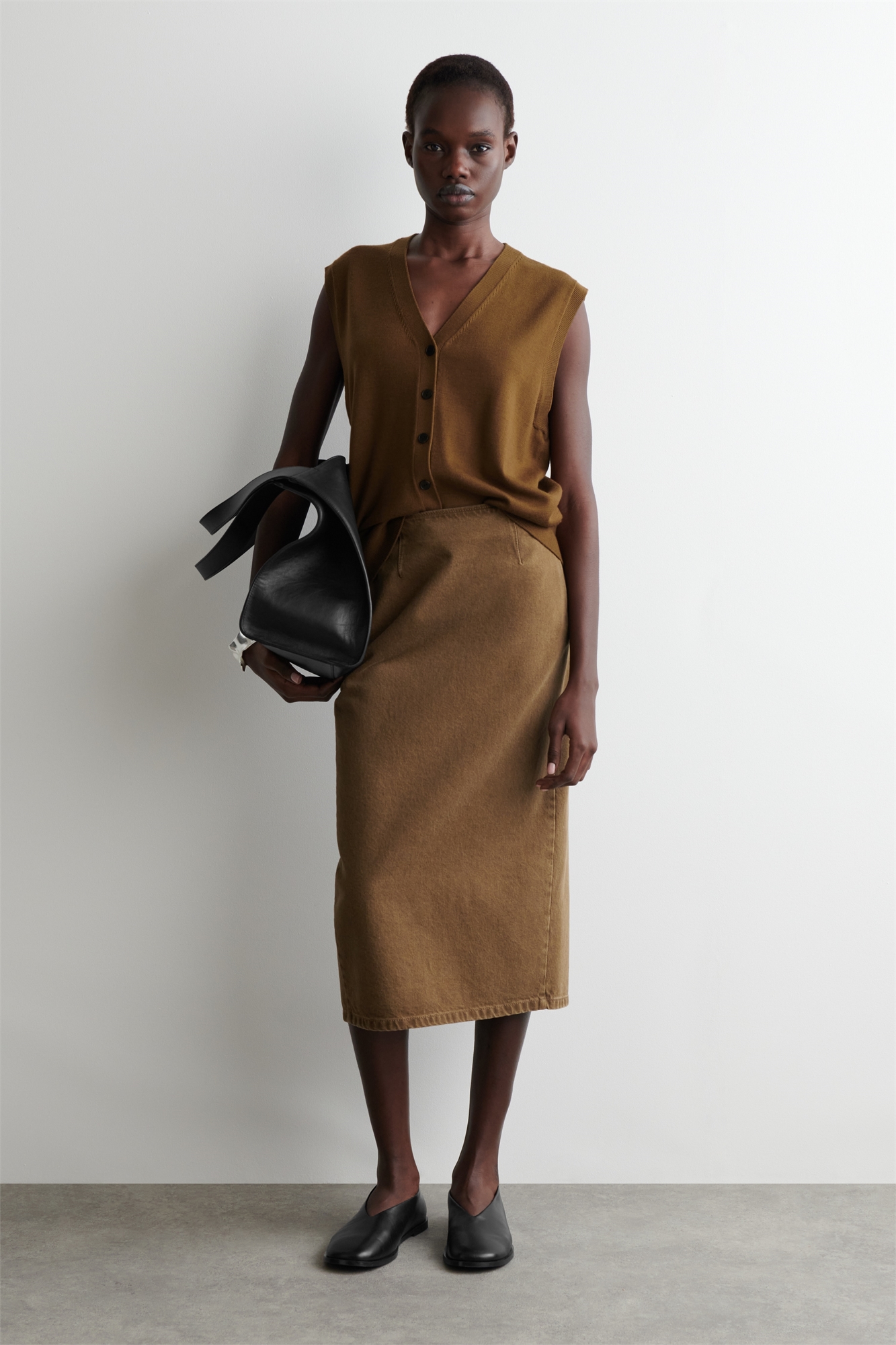 В этом сезоне команда женской одежды переосмыслила джинсовую ткань с чувством стиля нулевых. Эта юбка-миди из качественного органического и переработанного хлопка прямого силуэта с вытачками на талии и разрезом сзади предлагается в насыщенном карамельном цвете. Regular fitЗастежка на молниюОрганический хлопок выращен из негенетически модифицированных семян без использования химических удобрений и пестицидов Состав: 80% органический хлопок, 20% переработанный хлопок. Без учета отделки / Машинная стирка Длина по спинке для размера EU 36 составляет 75,9 см / Модель носит размер EU 36