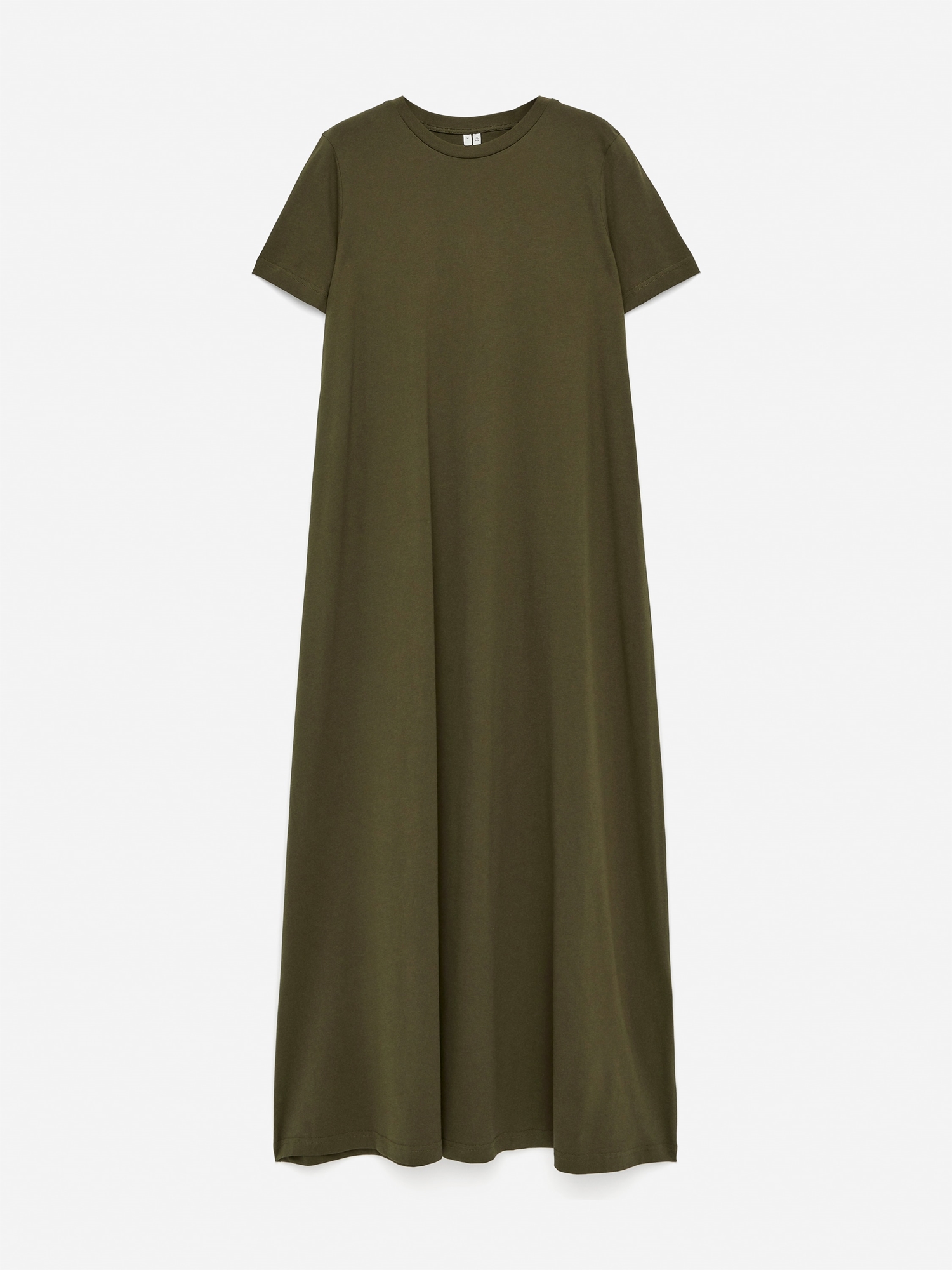 Платье-футболка макси сшито из хлопка. Модель А-линии с короткими рукавами и швом по центру сзади.