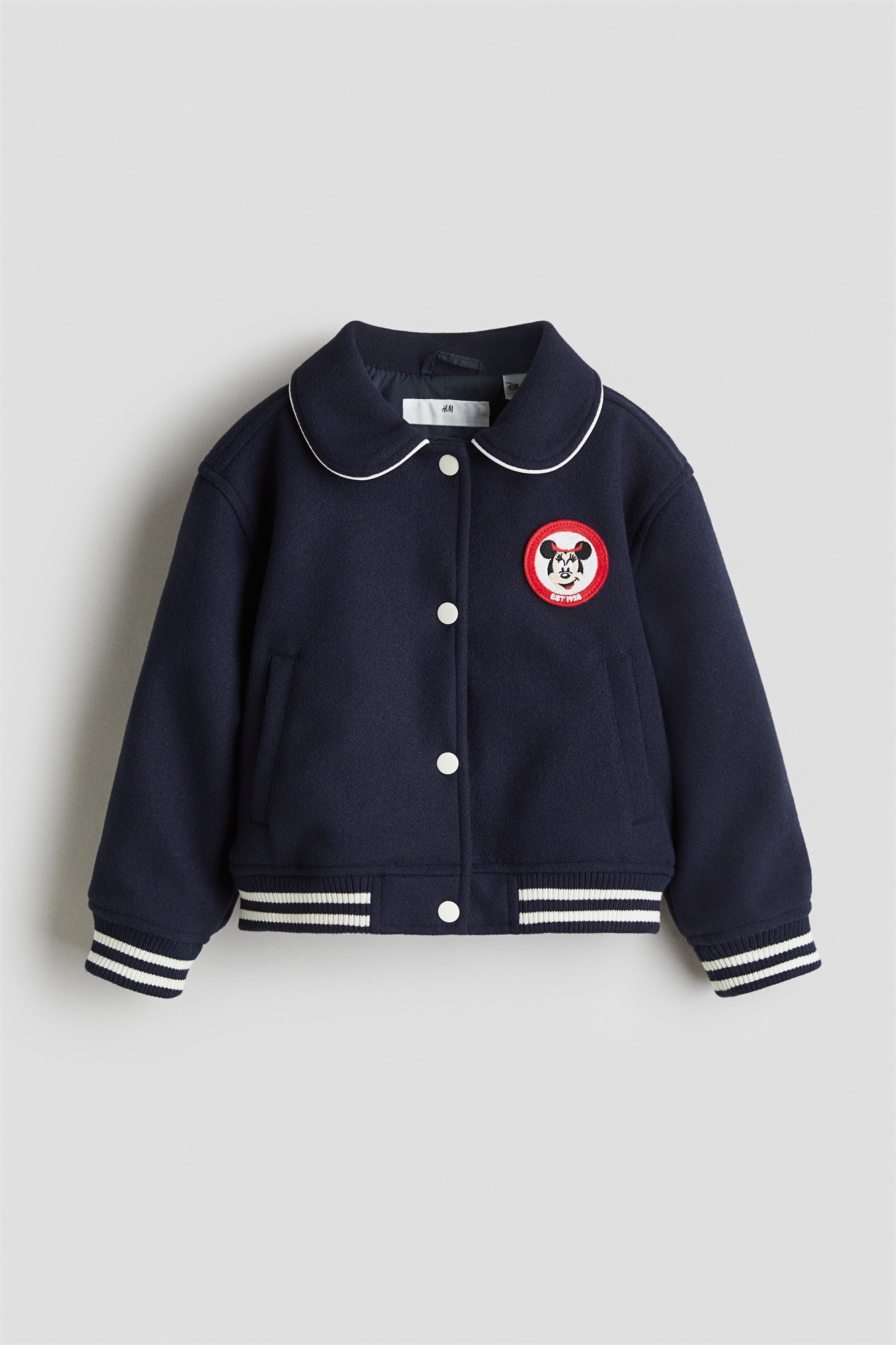 Бейсбольная куртка из войлока с аппликацией спереди и контрастными цветными деталями. Закругленный воротник с окантовкой по краям, застежки на кнопки спереди, прорезные передние карманы, манжеты и подол в рубчик. На подкладке.